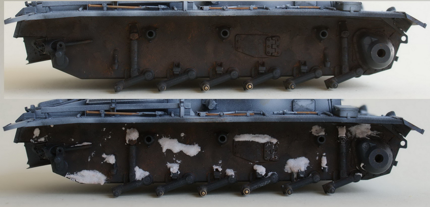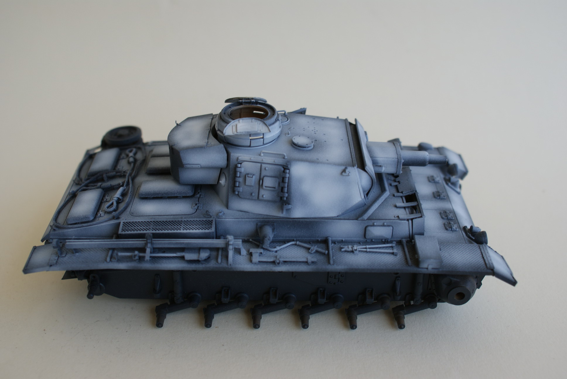Прежде чем наносить белый, хочу поделится своими мыслями и сомнениями. Судя по подписи к исходному фото танк относился к 19-й танковой дивизии. На фото сильно не разберешь есть ли номер на башне. Вопрос - если делать номер - оставить его на фоне серого или поверх белого камуфляжа и какого он должен быть цвета? Тот же вопрос по эмблеме.