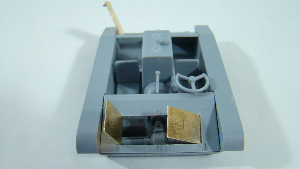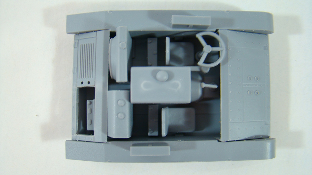 Створка вырезана и обточена, будет примерно так..в конце можно будет добавить еще кучу проводков ...которые в изобилии встречаются на фото разбитых танкеток.да и спартанское исполнение интерьера это частично спрячет..