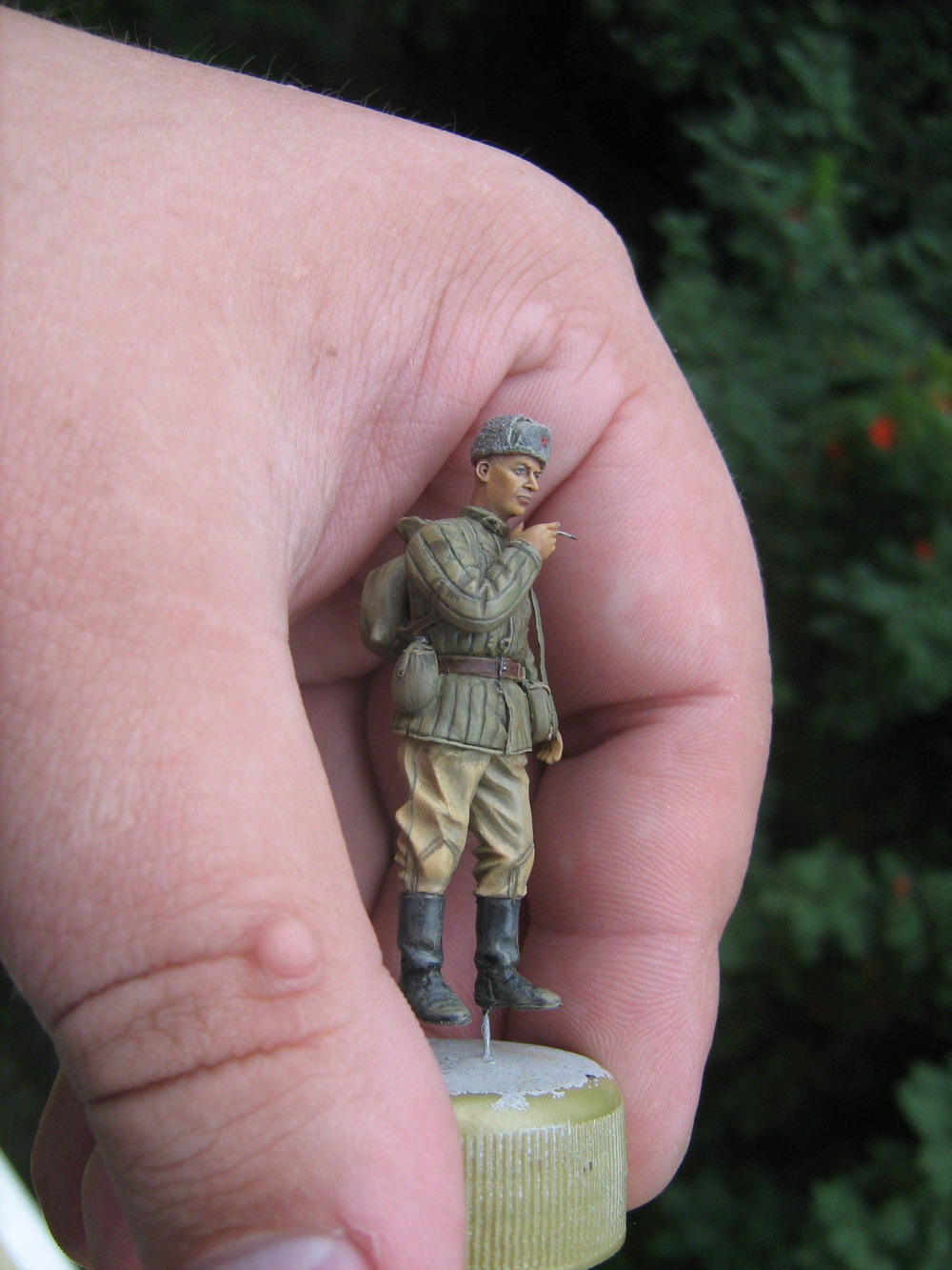 Завершил ещё одного бойца.Фигура из набора Dragon.Из дороботок:заменил голову на Хорнетовскую,кисти рук из закромов,ППШ,подсумок-Танк,немного подправил/запилил руки,ремень для ППШ-свинцовая фольга,сигаретка из проволочки,сапоги заменл на МиниАртовские.