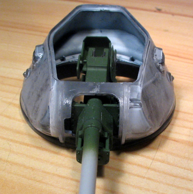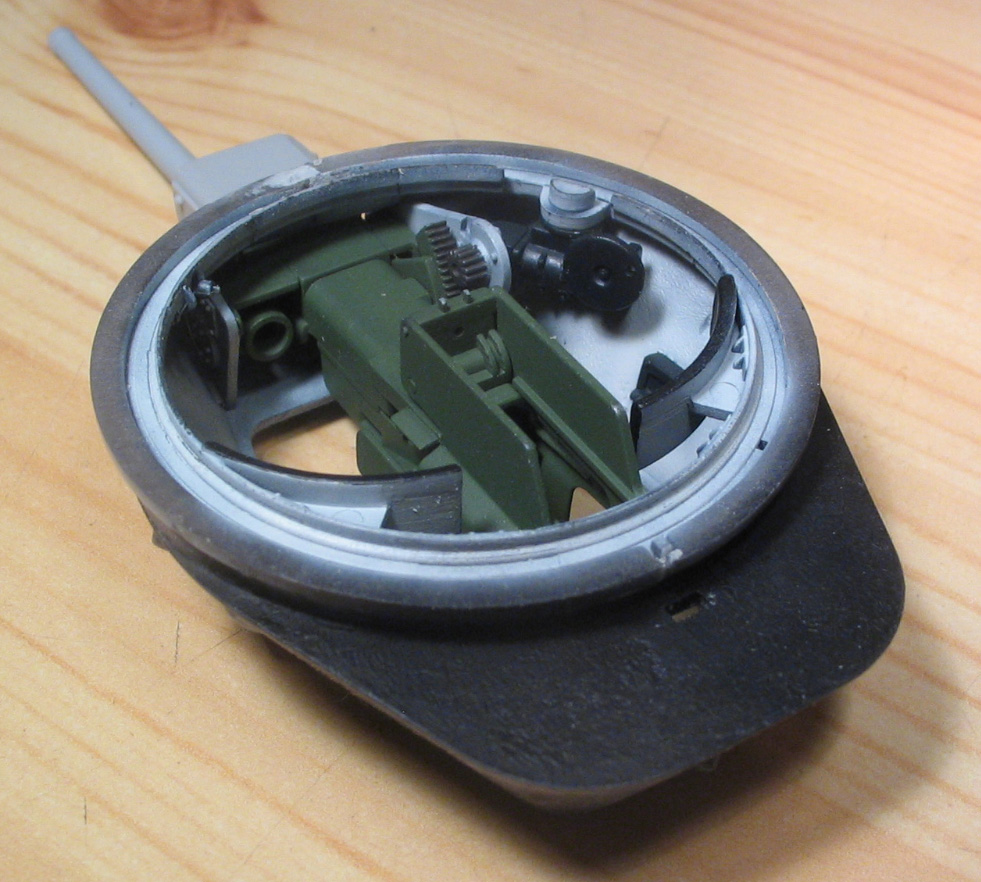 опять же заделано место стыка и проимитирована литая поверхность, затем закрашено чернои краскои. Рекомендую наносить черную краску как грунт и снутри и снаружи что бы башня затем не просвечивалась при хорошем освешении.