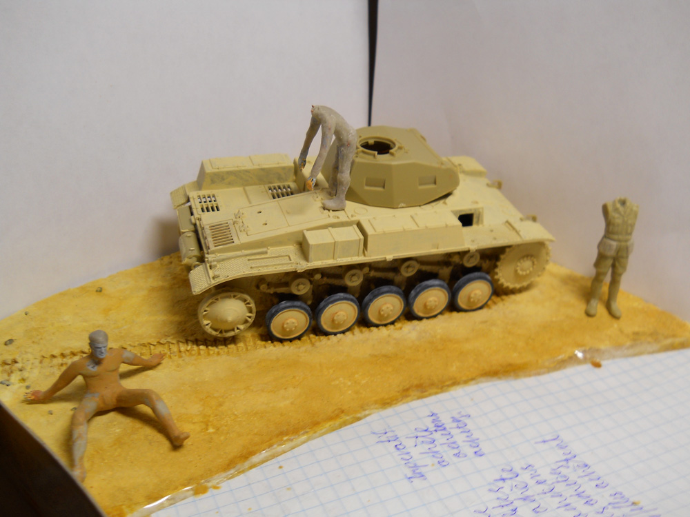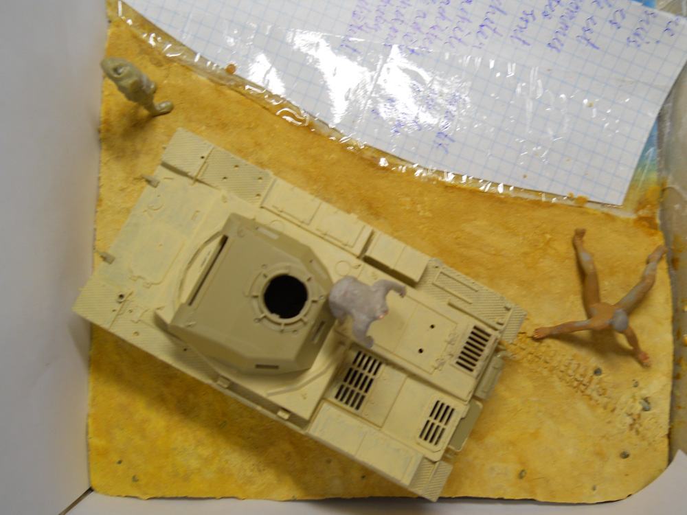 Вот такая картина вырисовывается. Немного высветлил цвет песка на более белый. На фигурке, которая будет с биноклем заново вылепил карманы на кителе-старые никуда не годились. Танк пока в процессе.