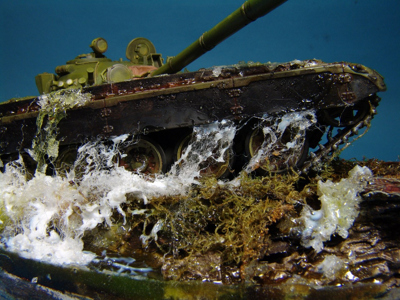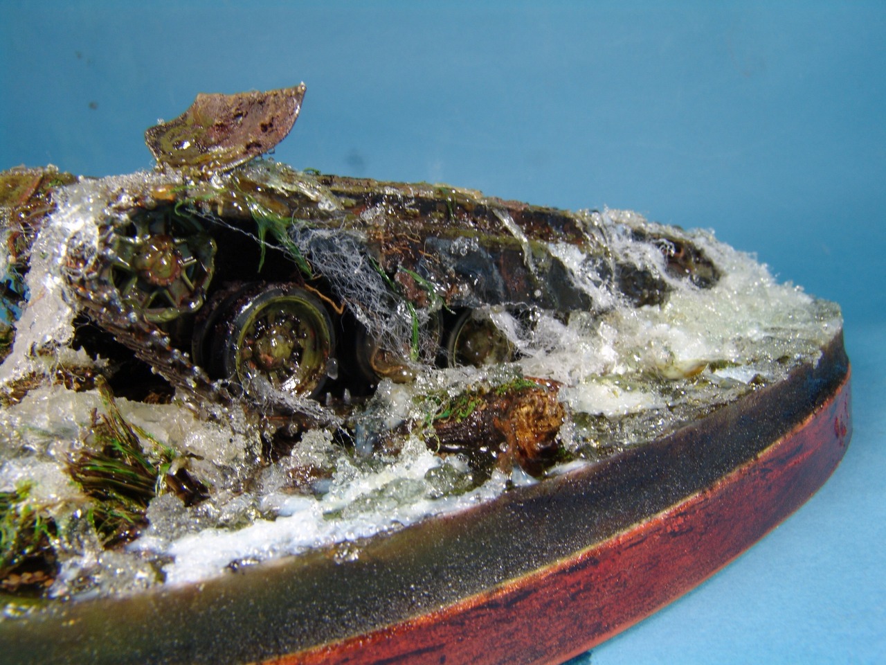 Под гусеницы,напихиваем синтепон который промазывается гелем.Через несколько часов,каждая ворсинка становится жесткой и на неё можно наносить следующий слой геля.Лишние ворсинки торчащие в ненужном направлении,позже обрезаются.Контролируем количество и общую картину,которая подумывалась изначально.Пока синтепон сохнет,его можно располагать,как вам захочется.Менять направление брызг или будущий поток.