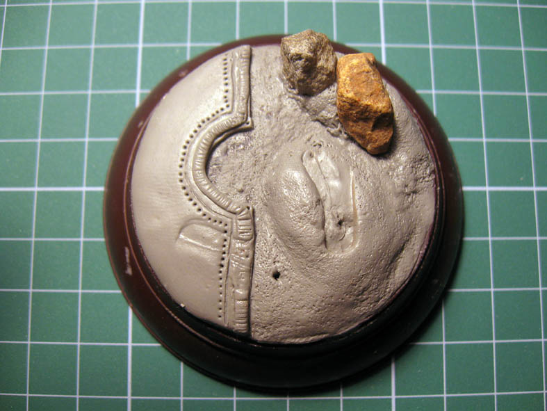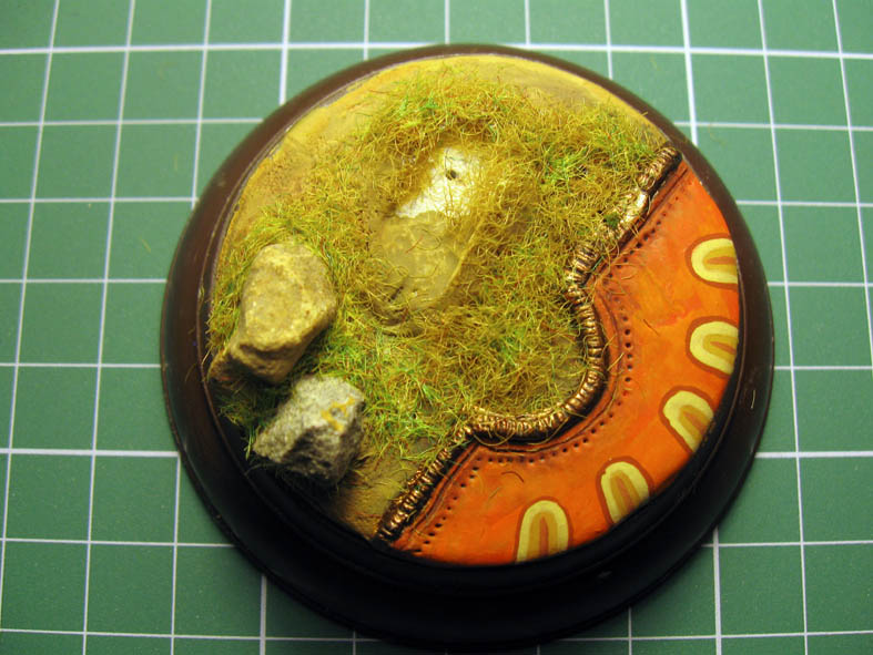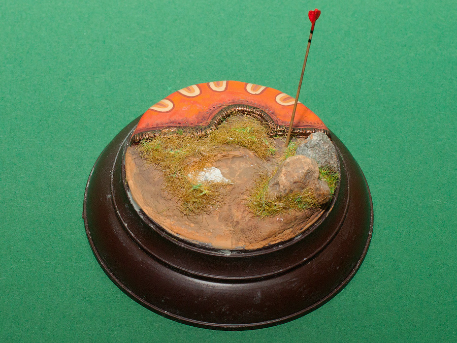 Нда... Скорее всего надо было всё таки делать его отдельным куском, дождаться когда застынет эпоксилин,а потом как -то соединить с подставкой- что бы была значительная щель, что бы глаз видел что это посторонний предмет на траве...