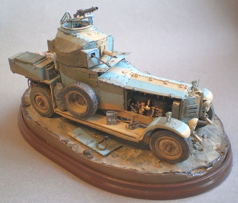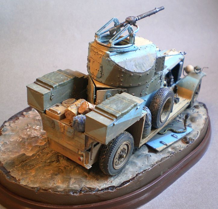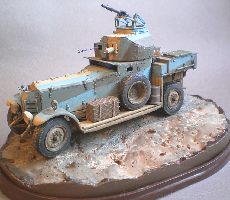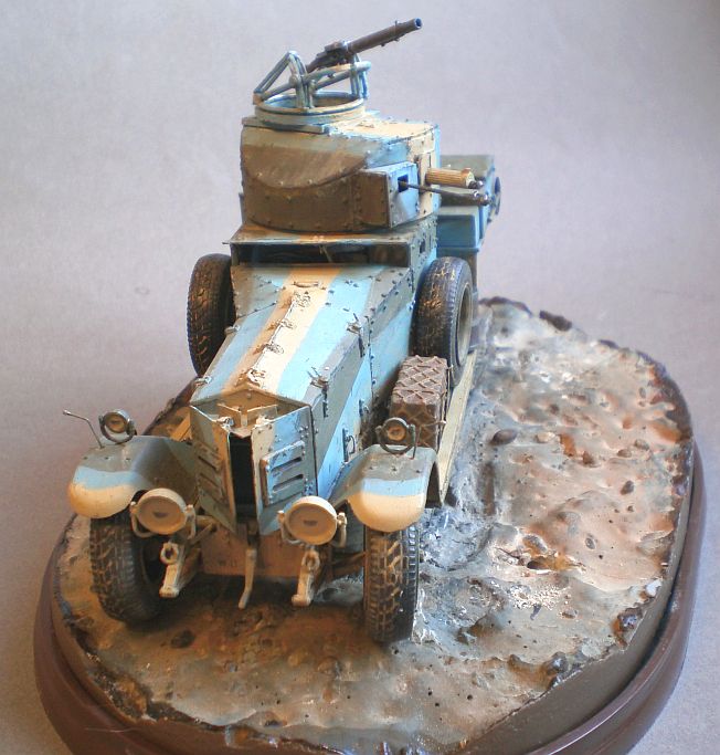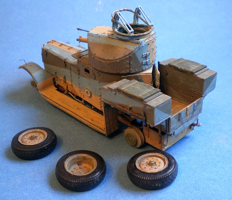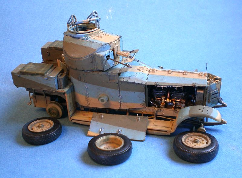 Можно думать и о запылении и чуть-чуть ржавлении. Машина - в сущности тесная бронекапсула с башней для защиты мотора и экипажа, поставленная на гражданское шасси с дощатым кузовком сзади. Подножки - тоже деревянные сверху, это видно по музейным фото, так что сколы там - до краски или дерева, но не до металла. Металликом слегка ободрал кольцо турели - там регулярно болтался стрелок.