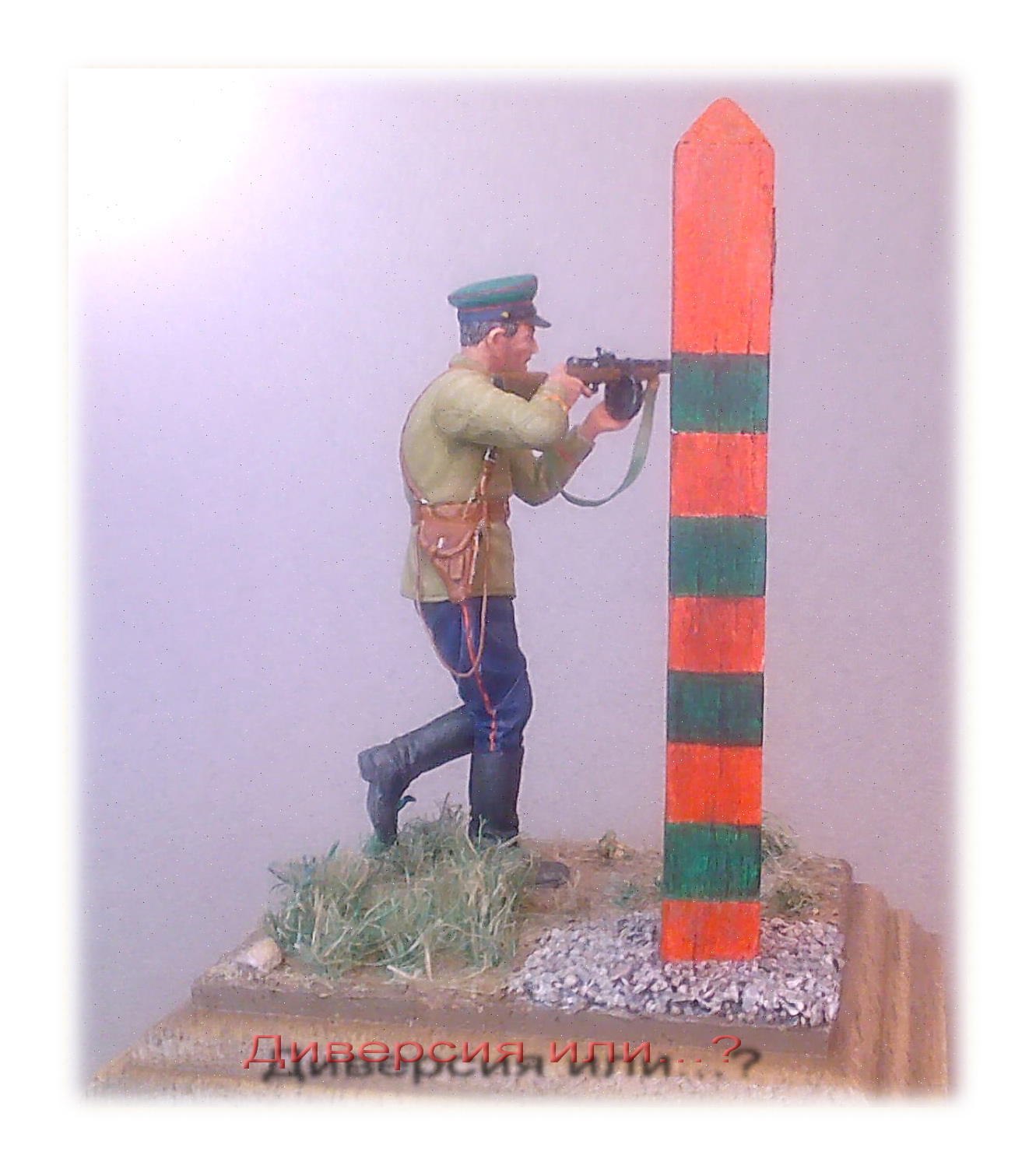 Что бы не создавать новую тему выложу тут же то, что меня отвлекло от проекта "Конь с седаком". Рабочее название этой виньеточки было "Диверсия или...?" и его же решил оставить. Все почти готово, кроме каски немецкой кски, которая будет лежать вверх дном у ног майора-пограничника. На ней осталось нарисовать "орлика", но в целом, виньетка готова.