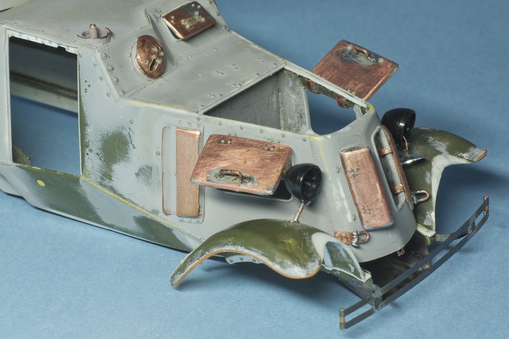 Сделал и примерил на пластелин задние крылья (поэтому они криво стоят). Еще предстоит обрастить их мелочевкой. Со стороны водителя будет оторвана от крыла бронировка баков и на полке останеться один из баков, а второй будет на земле