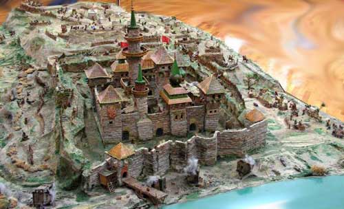 И модель города, выполненная школьниками. Называется "Модель турецкой крепости Азов до взятия Петром". Это, я так понял, возможный вид восстановленной крепости в период от 1642 по 1696 годы. Не знаю, насколько достоверно.