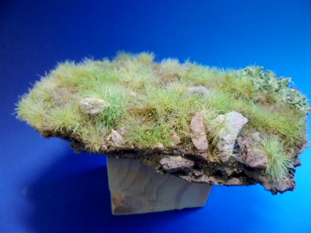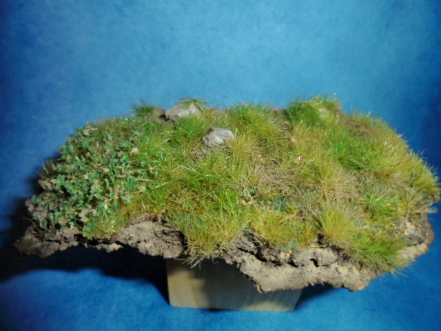 Основание делал из листового пробкового материала толщ.1,5мм.Вырезал три куска произвольной формы,чтобы они при наложении друг на друга образовали обрывистый рельеф,местами аккуратно обламывал руками.Потом все это склеил между собой под прессом из книг клеем супер ПВА.Через час намешал в этом же жидко разведенном клее немного пигментов средних оттенков,сухой строительной шпаклевки,чтобы смесь была сметаной.И широкой плоской кисточкой зашпаклевал все большие и неестественные щели.Через два часа,когда основание хорошо подсохло,удалил ватными палочками и нулевой шкуркой лишнее.Второй этап:Задул все аером черным грунтом.После намешал три землянистых оттенка и последовательно прокрасил,стараясь темный задувать в углубления и изгибы.В конце прошелся по граням чистым Дарк санд(все краски Валеджио).Третий этап:из готового Миговского набора-8351 вырезал по контуру кусок растительности и приклеил на цианкр.клей к основанию,постепенно прижимая от центра к краям.Затем обработал черной миговской смывкой.Четвертый этап:Сделал три кучки разных по тонам пигментов и смешал их с чистым медицинским спиртом до состояния смывки.Спирт имеет хорошую капиллярность.Тонкой кисточкой нанес пигменты по боковой стороне тем же методом-в углубления и изгибы темные по открытому и граням светлые.После высыхания прокрасил отдельные камешки.После установки фигур будет дополнительный покрас и тонировка.Смотрите и всем удачи!