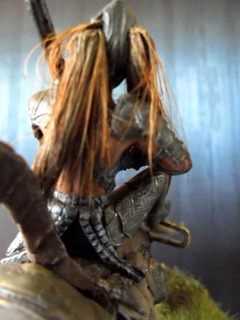Выкладываю фото с волосами.Пока только в анфас,так как фигурка снята с зубочистки и будет сегодня устанавливаться.По другому не держится.После установки еще будут добавляться локоны,подкрашиваться и причесываться,создавая обьем.Опишу технологию.Заранее обошел все местные хозяйственные и косметические магазины,накупил много разных кисточек.В основном использовал такие распушенные для визажистов.Сначала просверлил отверстия в шлеме,подобрал два отрезка проволоки небольшой длины и облепил небольшим количеством милипута.Почти сразу небольшими пучками со всех сторон стал приминать к милипуту.Да,проволоку я сразу постарался изогнуть по рельефу плеч и на конце оставил 2мм,чтобы после вставить в плотную в отверстия.Выждал три часа пока все схватится,но каркас пластичен.Начал аккуратно отрезать и формировать небольшие пучки разной длины,мазать концы кисточкой с клеем супер ПВА.Так же осторожно прижимаем к каркасу пинцетом,сразу убирая выступивший клей.Лишние,неправильные волосинки убираем(эта процедура многократная).Часа три даем просохнуть.Потом начал окрас.Мне нравятся брюнетки,поэтому за базу решил оставить натуральный цвет,благо щетинки изначала с переходными тонами.Красил аэром,стараясь высветлять кончики волос иверхние пряди.Кисточкой акрилом не рекомендую,так как клей на водной основе и волосы начинают выпадать.После очередного просушивания аккуратно вклеил косички в шлем на 5-минутный эпоксипол,разглаживая иголкой,чтобы не было резкой ступени.После подклеил мелких волос.Смотрите,критикуйте,удачи!