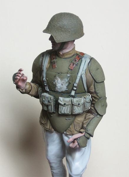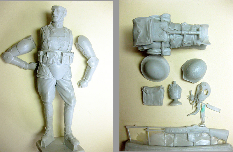 Первый минус (для меня лично)- голова отлита вместе с туловищем. Возможно это и не так уж страшно, но поскольку я за много лет привык красить голову всегда отдельно, то просто очень неудобно крутить в разных плоскостях всю фигурку, а не голову на зубочистке. Лицо к сожалению слишком замылено, с плохо выраженными глазами и рельефом, но это прототип такой был использован, он и в оригинале плох. Зато на лице уже сделана "щетина", так что без вариантов красить небритого придется. Если Павел будет выпускать второй тираж, то есть смысл поменять голову на более проработанную и нейтральную и делать ее отдельной деталью. Руки требуют небольшой подгонки, шпаклевки потребуется минимум.