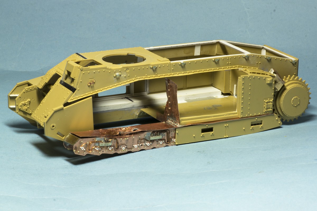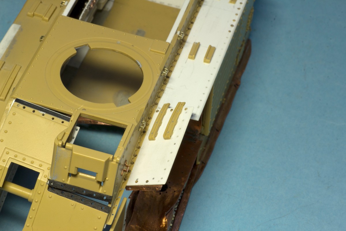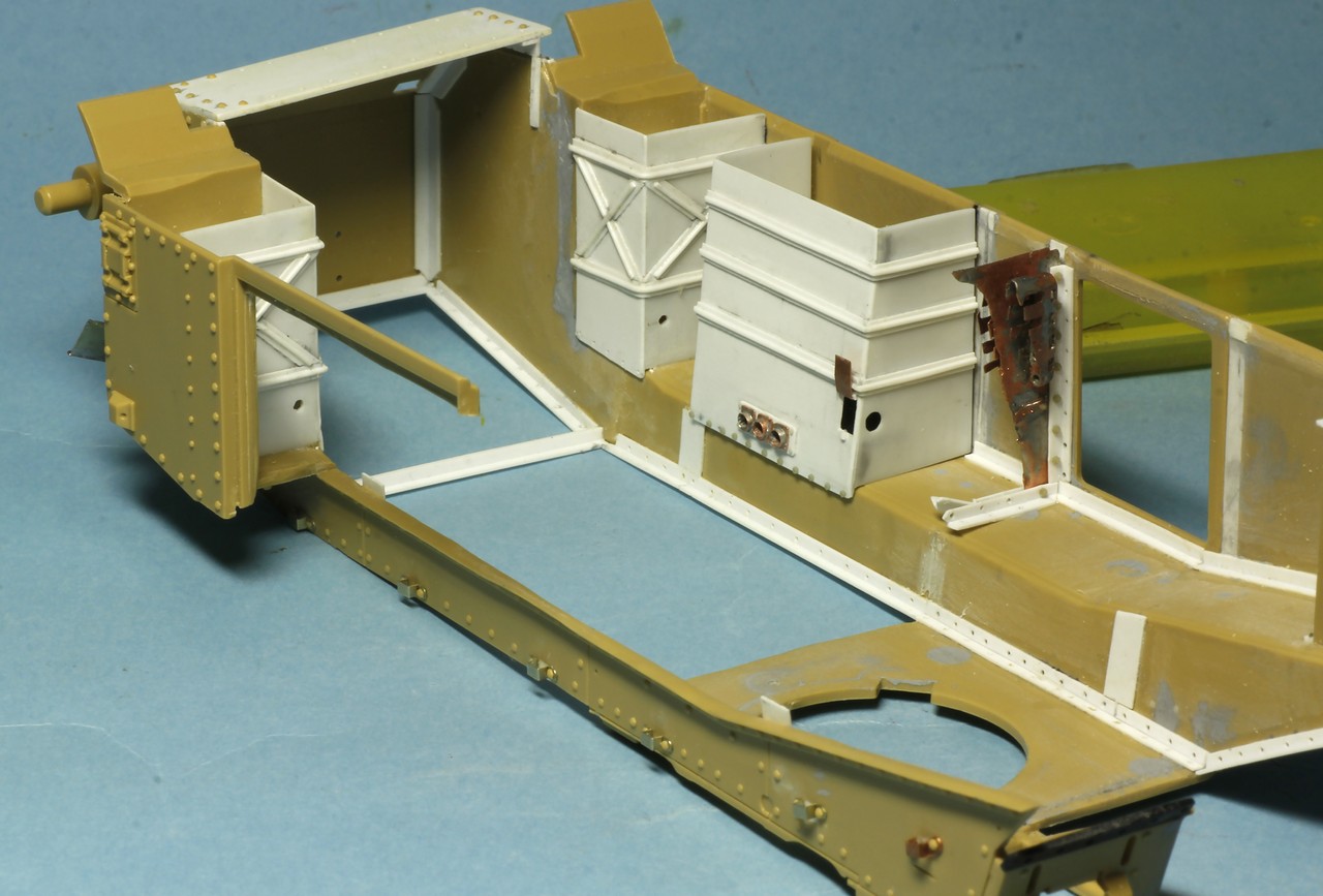 Теперь о французах... Сделал инсталляцию на правой внутренней стороне корпуса: остатки перегородки между БО и ДО, остатки кассет для 47 мм выстрелов, баки: два на правой стороне и один на левой. Теперь надо рассадить много-много болтов и гаек в внутри корпуса...