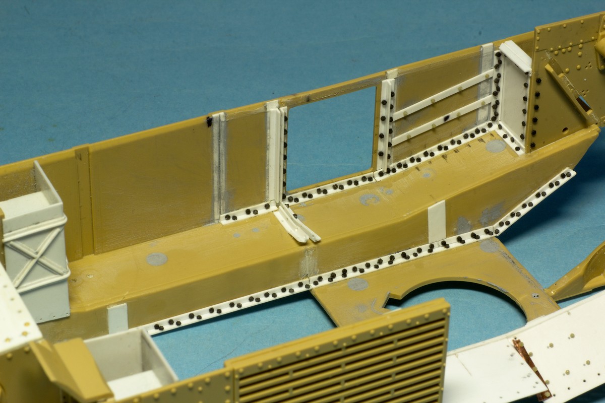 Сделал полки. Аберовское травление у меня было на широкие полки, так что пришлось переделывать на узкие. Заодно и удлинил задние брызговики, которые и Тамия и Абер делают короткими, хотя большинство B1bis на фотографиях имеют длинные брызговики. Полки (с точнее элементы их крепления на корпусе) позволили начать обустраивать внутренний мир поделки. Пока сделал имитацию каркаса из уголков.