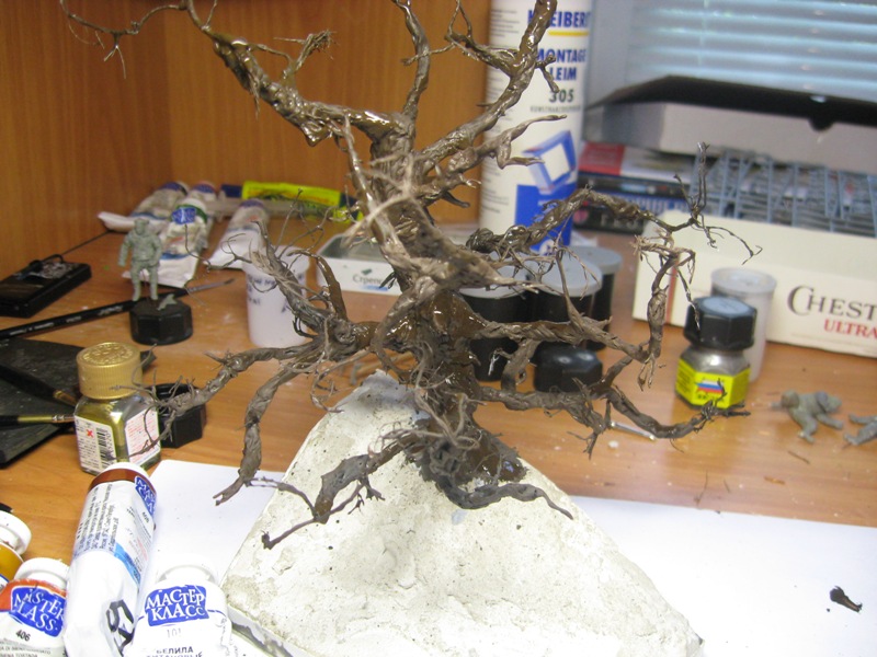 нанес базовый слой,краска еще не высохла,по этому кое где краска блестит.Сейчас довырезаю листья,и буду докрашивать дерево.Смывка,тонировка,сухая кисть и т.д....