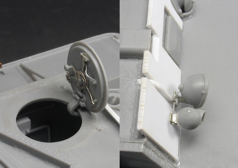 Крыло левое гнул по фото. Гнул под горячим воздухом фена. Чтобы лишнено не нагнуть я обмотал танк бумагой прорезав небольшое окошко в ней в районе места гибки. После помятость ещё немного подрихтовал поставленным на низкую температуру паяльником. Корпус готов к окраске, осталось сделать башню.