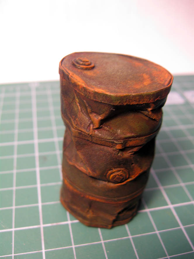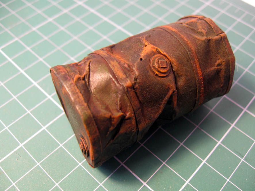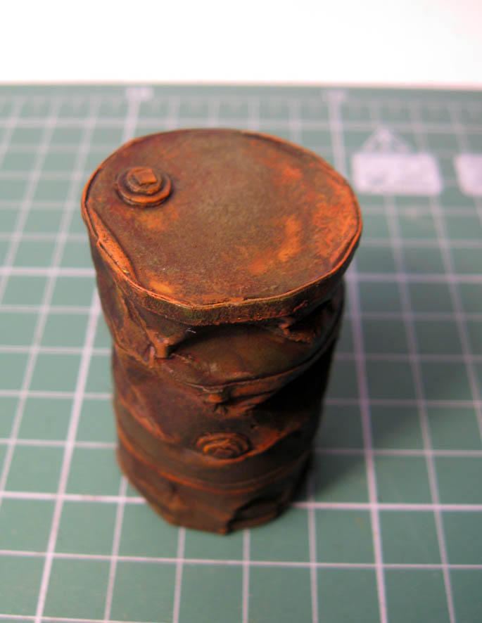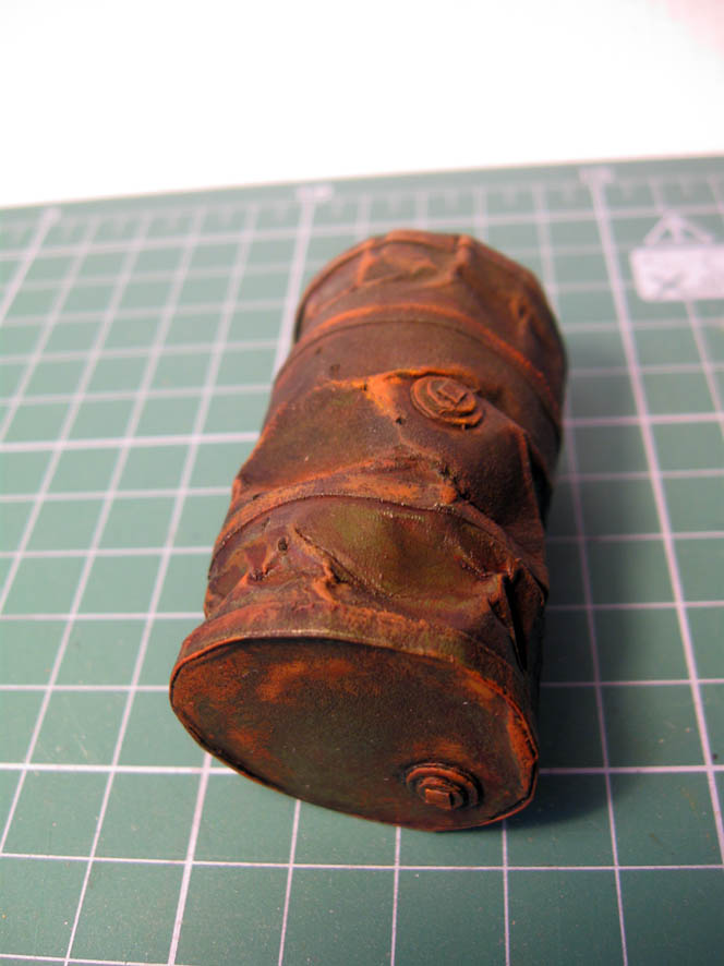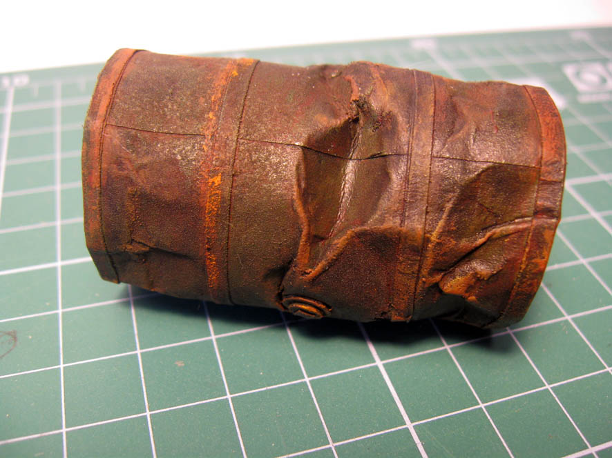 Что сделал- всё тоже самое (кроме тонировки маслом). На краску (аэрограф), поместил смывку. После этого акрилом (имитация ржавчины)- почти сухой кистью- на бока и грани бочки.