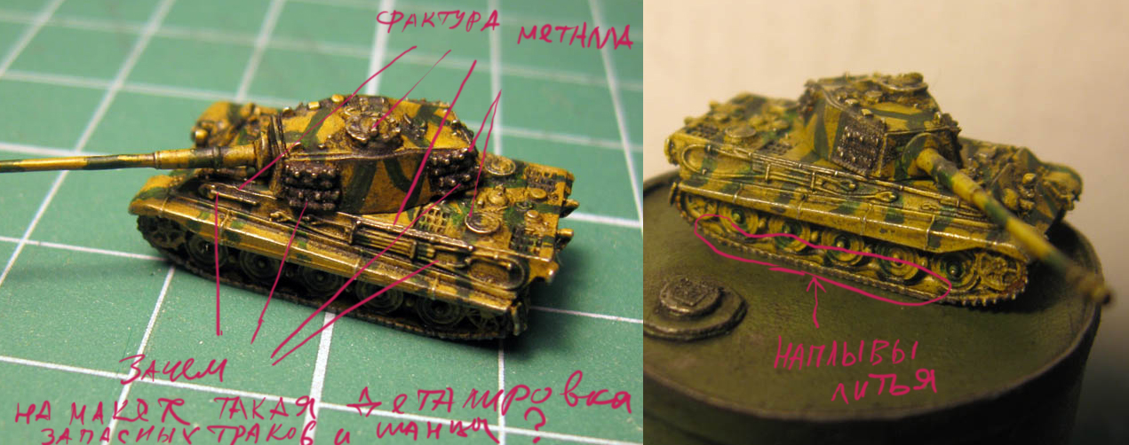 И фердинанд в том числе.Да - это самая реалистичная модель. Скорее всего он сделан не из бумаги, а выпилен из дерева, но Ваш танк отлит из металла и это видно невооруженным взглядом(смотри фото).Причем тонировка - это подчеркивает еще сильнее!Я понимаю, что такая микро модель по своему качеству исполнения - уже маленький шедевр, но мне кажется какую то часть деталей можно было бы убрать (например запасные траки на башне и эвакуационные тросы с шанцевым инструментом с бортов)для МАКЕТА танка мне кажется это лишней деталировкой.И всю фактуру металла тоже можно было бы закрасить, тогда он будет более стилизованным. Хорошо,что сколы с ржавчиной не стали рисовать и добавлять личных вещей танкистов(каски, скатки и т.д. )!