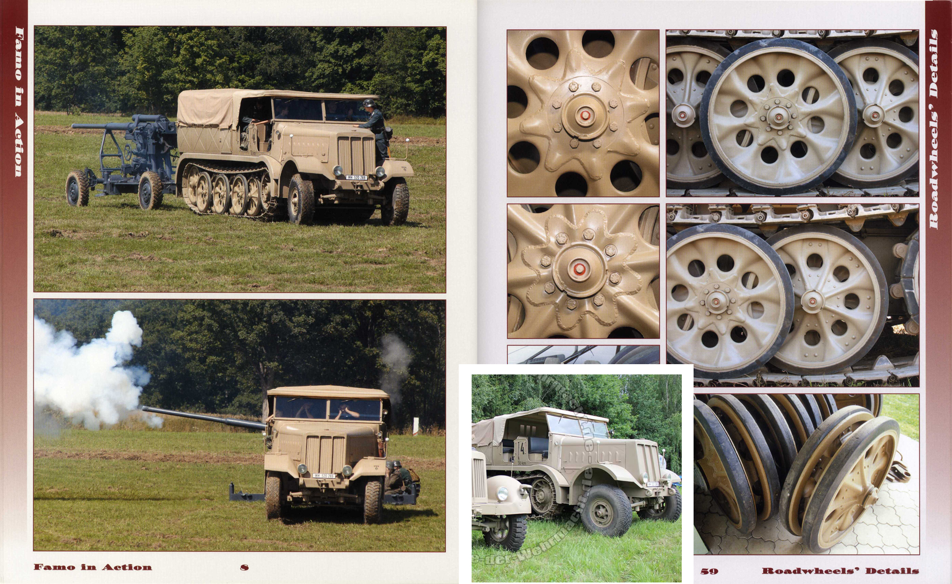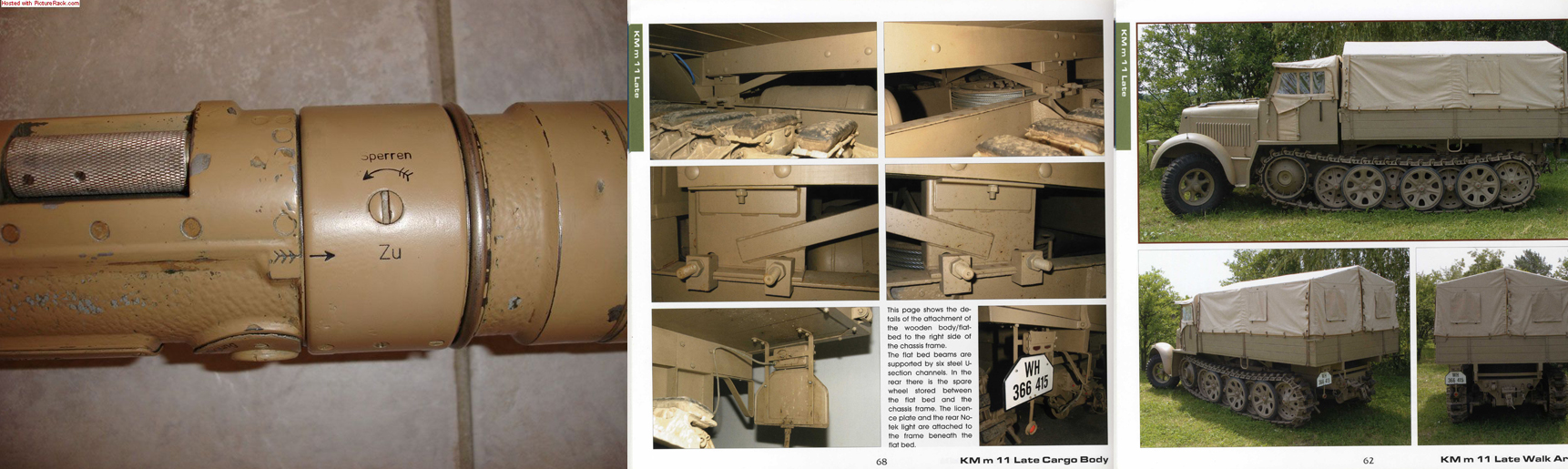 Вот наглядное сравнение. Слева Ваш агрегат, справа тот же Sd.Kfz.7, что и на моем фото в посте #314, только другая фотосессия (из книги). Посередине деталировка этой же машины, снятая в помещении при искуственном свете. Согласитесь, разница между Вашим цветом и моим (при почти одинаковых условиях фотосъемки)почти сгладилась.