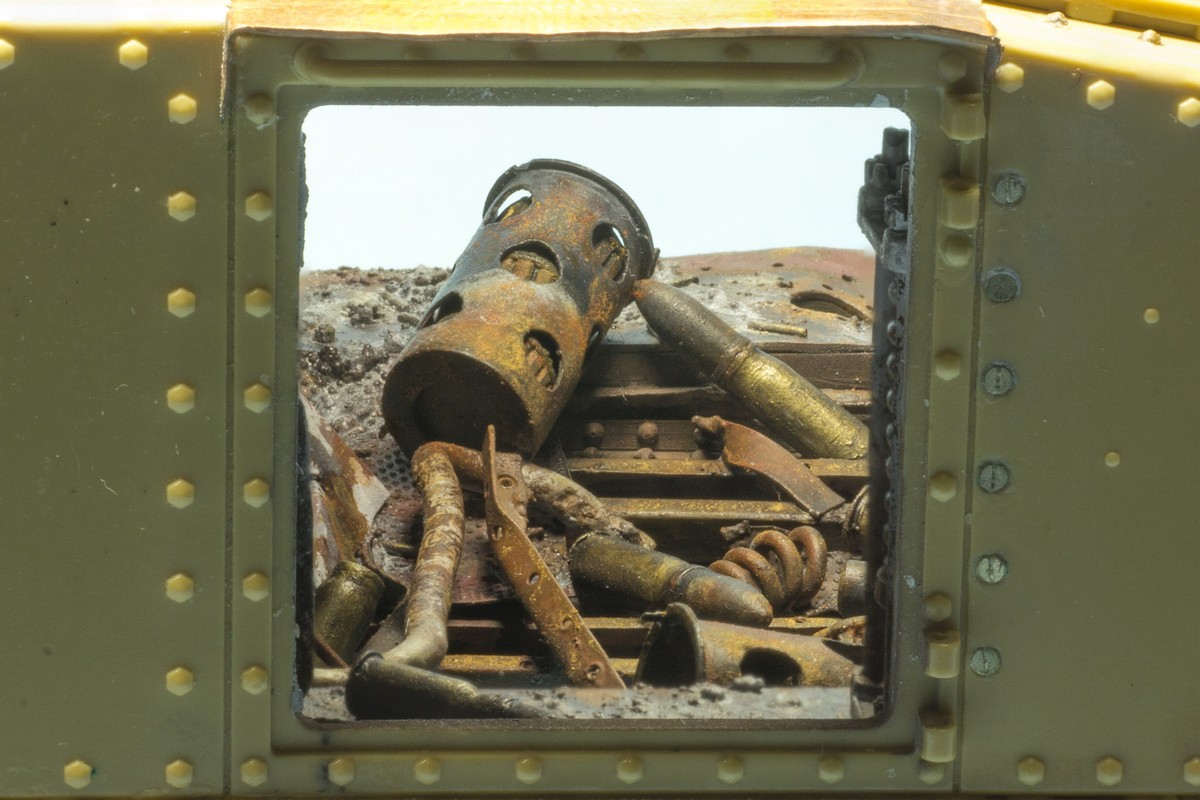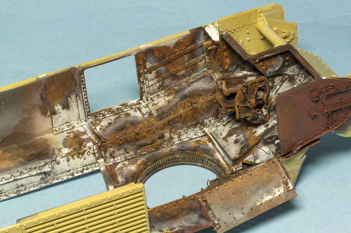 Я в принципе почти так и делал: или из задутого базой черно-коричневого "поднимал" детали от уровня к уровню, или "опускал" в тень более темной краской. В итоге пол у меня почти черный, а все что выше идет от коричневого к желтому. Пепел тоже на полу темнее, чем на лыжах. Есть более яркая и красочная зона у стенки моторного отделения (где пролом в одном боку, дверь в другом и погон башни сверху) и более темная передняя часть под орудием. Рисовать точно по конусам источников света для меня очень трудно, так как основных источников пять (два сверху, два по бокам и один спереди-снизу).