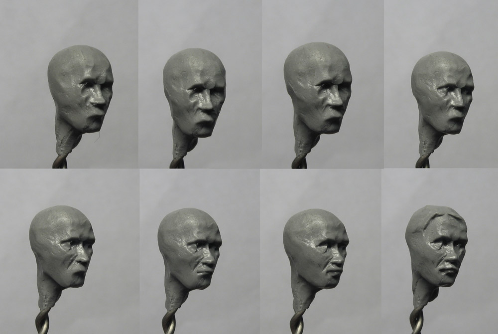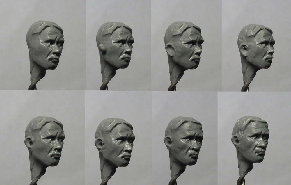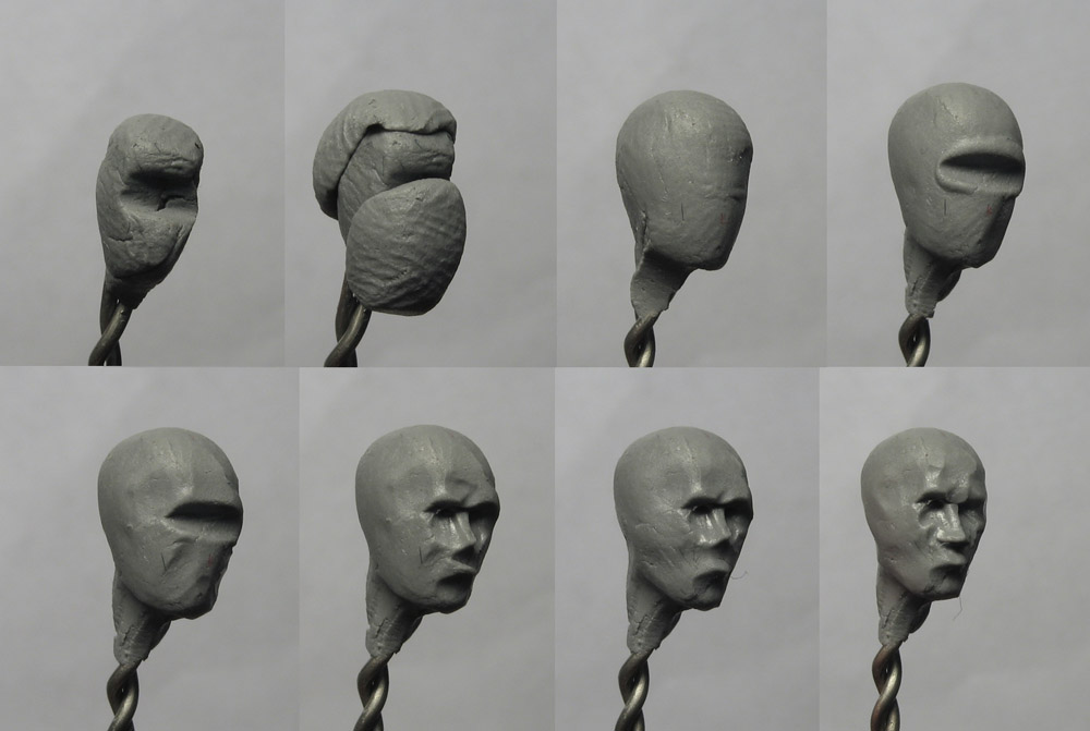 Наконец собрался и сделал пошаговое фотографирование лепки головы в 24 шага. По очередности фотографии идут слева-направо и сверху-вниз. Сорри за качество фото и головы: фото делались на рабочем месте, а не на "студии", а голова учебная и никакой культурной и эстетической ценности не представляет.
