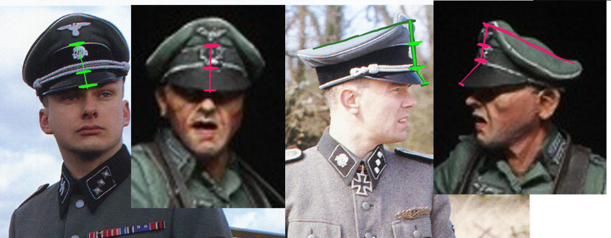Сравнил с фото реальной фуражки - козырек переразмерян почти вдвое. На треть точно.