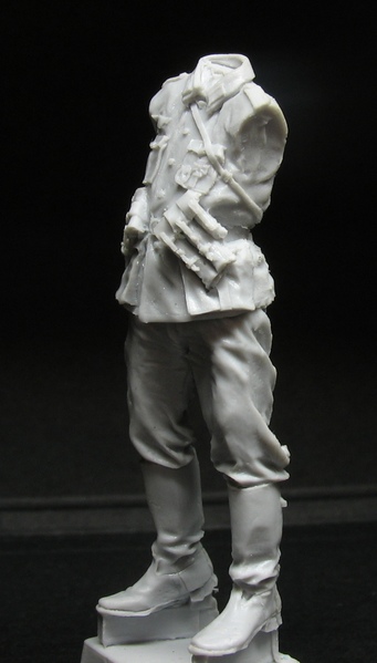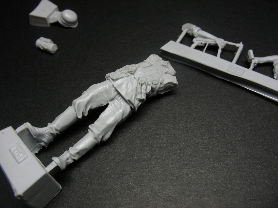 Общее количество деталей в наборе небольшое так как основное снаряжение как то сухарка и подсумки отлиты одной деталью. Из плюсов "живая" не деревянная поза, оружие отлито одной деталью с рукой (труднее чуть красить зато реальный хват) присутствуют такие элементы как например противоипритная накидка приторочена к противогазному бачку, ну просто нравятся мне вот такие мелочи. Да и сама скульптура неплоха, но не без недочетов. Но об этом чуть позже....