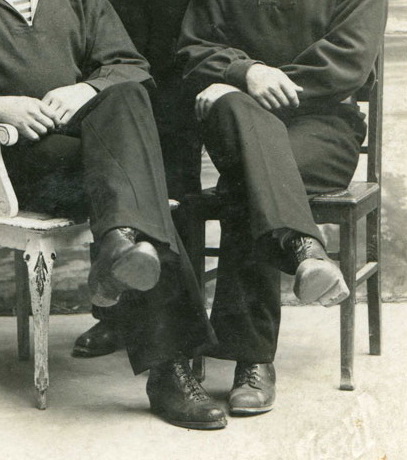 О моде: Подворачивание голенищ имело место в течении всей войны, что и видно на фото. Смысл, видимо, таков: широкие клеша достаточно тяжело засунуть в узкие голенища сапог. (На некоторых фото с кораблей видно, что сапоги имели достаточно широкие голенища (растянутые?):question:) Отсюда, похоже, и второй момент упомянутый на планшете: "напущенные брюки".