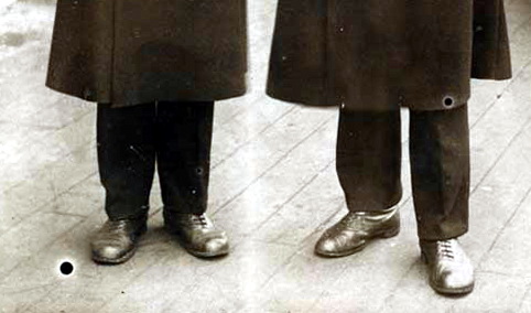 Вообще на фото все батинки выглядят черными пятнами, либо блестят начищенные носы торчащие из под клёшей. Но думаю, что для наших целей вполне подойдут фотографии приведенные на планшете. Цвет ботинок - черный.