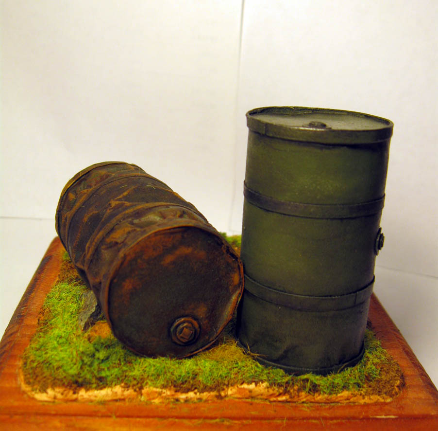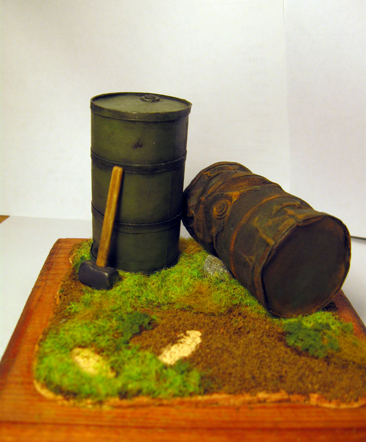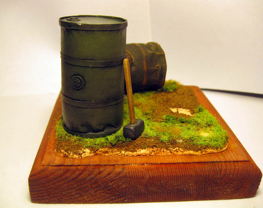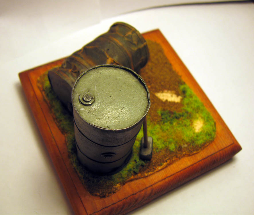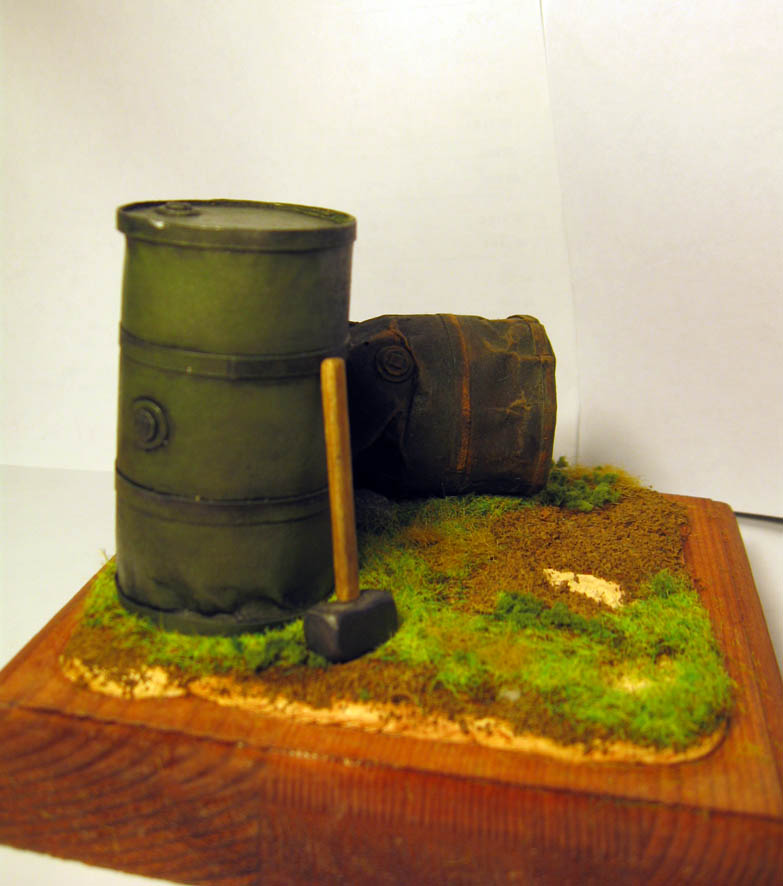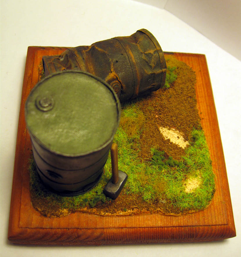 Всё- думал закончить... Но глаз требует "мусора" бычков, грязных тряпок (ветоши), листиков (жёлтых и зелёных). Под танк хочется подложить брезентик (сверху бочки). Опять же присыпать пигментиками...