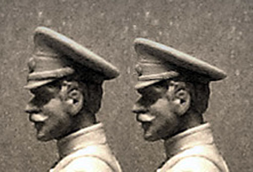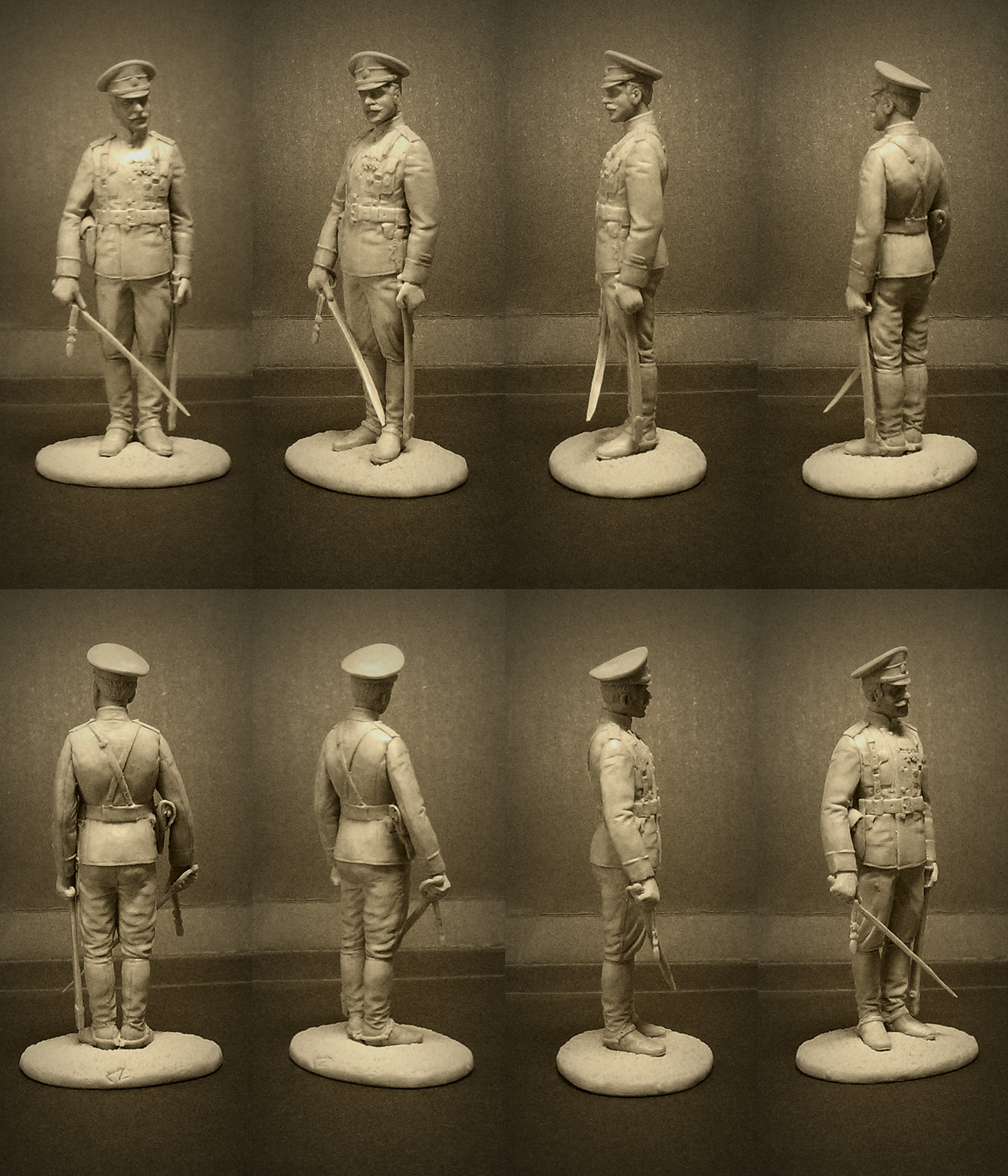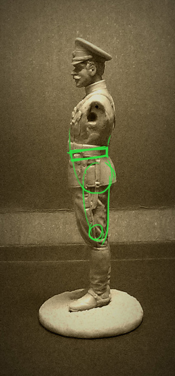Общее: молодцеватость и подтянутость ушла. Ну вы помните «корпус тела слегка подать вперёд, плечи развернуть…» Голова сильно наклонена вперёд, фигурка завалилась на каблуки, плечи уехали вниз (именно из-за этого руки кажутся непомерно длинными). Руки в запястьях сломаны. Правое предплечье дугообразное. Прав Немилов - нескладный офицер… Снаряжение и перед кителя перекошены вправо. Хоть и поправил пройму кителя по совету svt (спасибо, Сергей), ширины плеч и груди в целом это не прибавило. Передней части наплечных ремней и кожаным застёжкам не хватает объёма. Поясной ремень снаряжения (прав А.Толкалин) поднят на животе. Произошло это из-за того, что снят обвес, тянувший его вниз по пояснице своим весом. Обвес ушёл, его вес - остался. Но ремни плохо читаются, их грани "зализались" практически на всём их протяжении. Ножны слишком опущены вниз. Длина пасовых ремней чрезмерна. Клинок кривой. Темляк переразмерен.