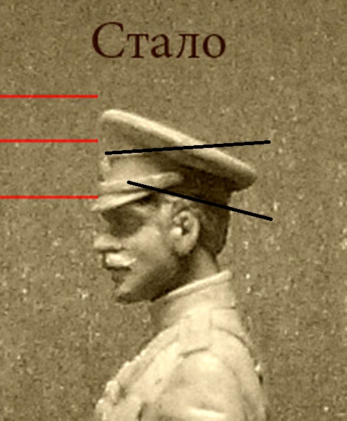 Что же касается именно фуражки (раз уж Вы её сами выделили), то после доработки она стала лучше. Но, всё равно никуда не годится. И в первую очередь это видно по околышу. Который не только слишком широкий, но ещё и кривой. Его верхний и нижний край должны быть параллельны. А теперь посмотрите, что у Вас