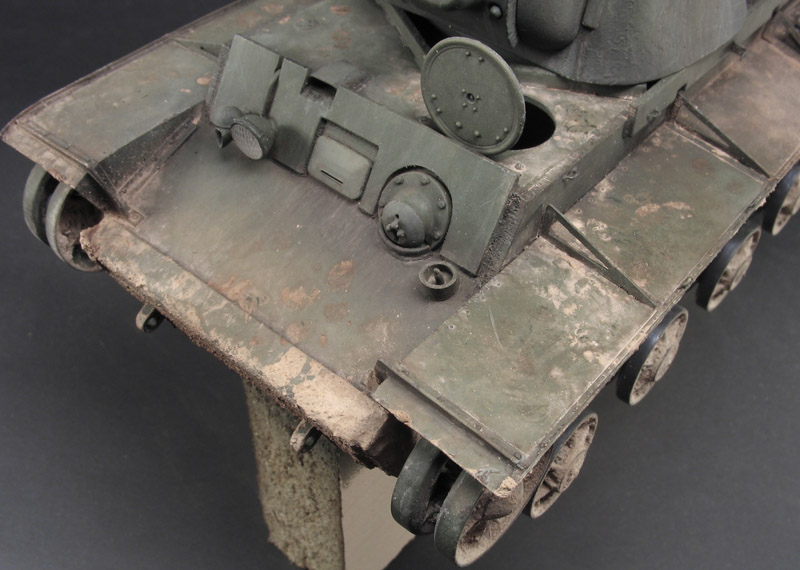 В настоящее время выполнена модуляция, фильтры (темперой), выгорание краски (маслом и пиненом), смывка (темная МИГовская смывка), двухцветные сколы (темпера), обработка графитом для имитации металла. Впереди предстоят следы дождя, надувка из аэра пыли, обработка пигментами, работа с траками и окраска мелочей (трос, траки, бревно и проч.).