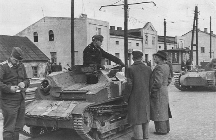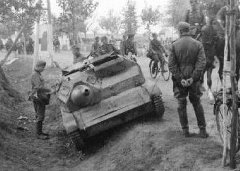 ITR, Учебная? а я думал тягач или что то вроде того,интересных-странных фото много с участием танкетки ,вот например, не разобрался судя по всему экипажи немцы? ну по нестандартным для поляков фарам точно должны быть немцы.Как я понимаю это уже их камуфляж серый с оливково-зелеными полосами?
