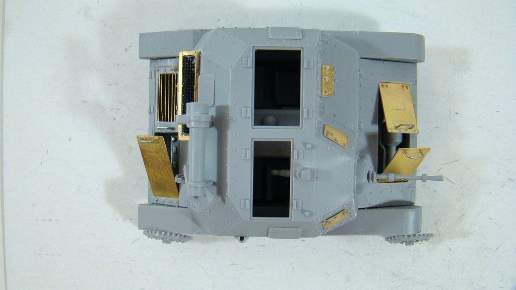 Дальше добавил боковые окошки пулеметчику которых в наборе и в помине не было,,,и поменял все таки ручки на створках моторного отделения на самодельные из проволоки,больно уж деревянными они смотрелись по сравнению с передними.
