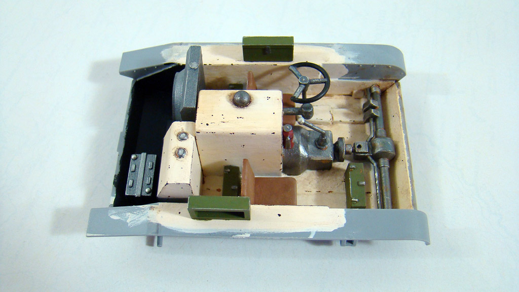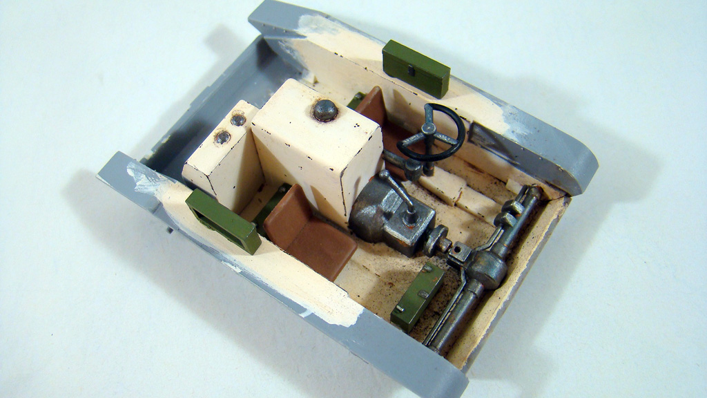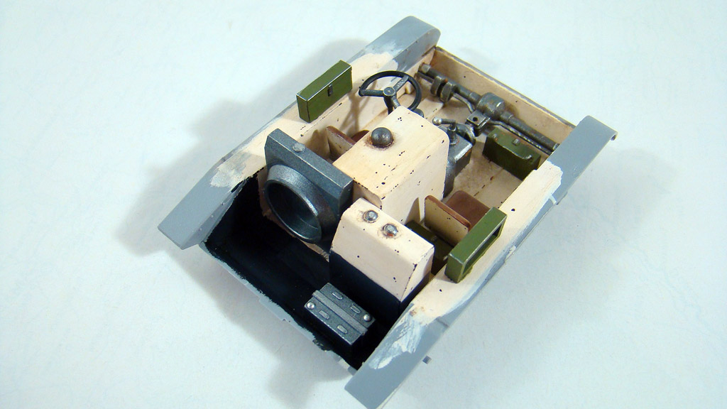 Начал красить интерьер, основной цвет LIGHT FLESH от валеджо, сколы ощипанной тонкой кистью (смотри фото) довольно интересным цветом smoke ,сиденья краской хома ящики оливково-зеленым от хобби нитра, на достоверность цветов не претендую, скорее это как я его вижу .После кое где прошелся карандашом и тамиевской пудрой, и совсем чуть чуть ржавчины .И в конце смывка коричневым маслом.(верх рубки показан без смывки) Да красил по жаре, где то 35 градусов было в помещении как минимум, краска вела себя очень неестественно как кисель..я уже давно подметил что жара губительно сказывается на покрасочных работах.