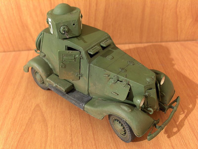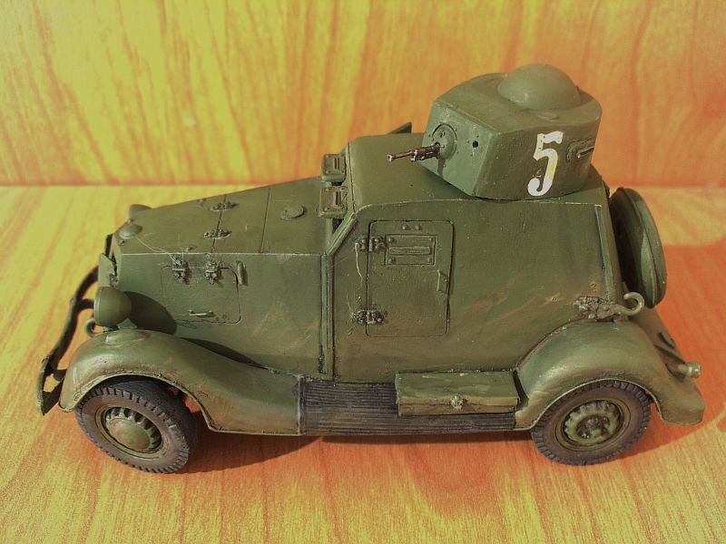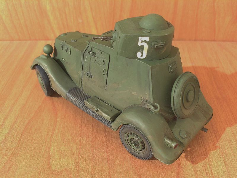 Опять же по сколам и потекам - смотрел немногие свои фото - там броневички довольно ухоженные. Разве что крылья мяли - и у меня немного есть. В общем, и логично - потеков соляры быть не может, в РЕАЛЬНУЮ такую грязь не сунешься особо, не Т-34, да и служили они все больше как штабные/командирские (в 43 г. уже были более подходящие машины для разведки, типа 4х4 вездеходов М 3 Скаут/БА-64), ну и с пехотой не наступали.