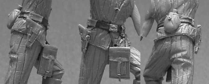Например, у этой фигурки ягодицы абсолютно разного размера, левой практически нет.А стеганая одежда ,как лакмусовая бумажка это только подчеркивает. На правой ягодице, например идут пять вертикальных прострочек. которые правильно идут вверх к поясу, а на левой с трудом уместились три, причем нижние упираются в вертикальный шов.Поэтому на фоне вот таких недочетов абсолютно теряют всякую ценность проработанные пряжечки и прострочки.Всё-таки лепка должна идти от общего к частному.