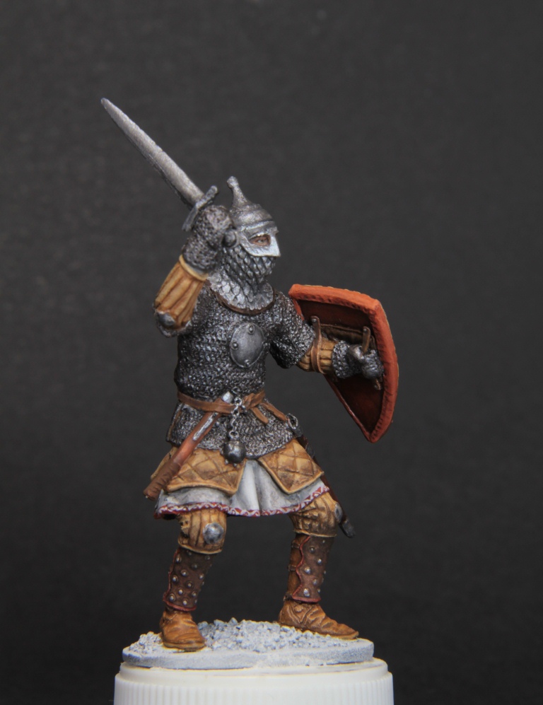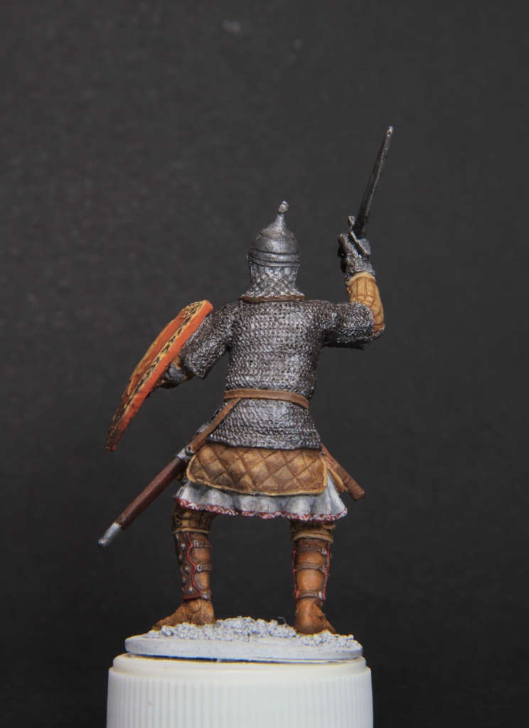 Oskar, Я тоже не крупный специалист в теме, но реконструкция щита, которая у меня есть предполагает, что рисунок плоский без выпуклостей. В моем случае деталировка как я уже говорил оставляет желать лучшего и думаю, что выпуклость исчезнеть в слоях краски или ее особо не будет видно. Что касается кафтана или рубахи не знаю что на нем одето из одежды, думаю красить буду не в синий цвет, а в какой-то теплый тон, чтобы не повторяться с тобой и по цветовой гамме было более гармонично.