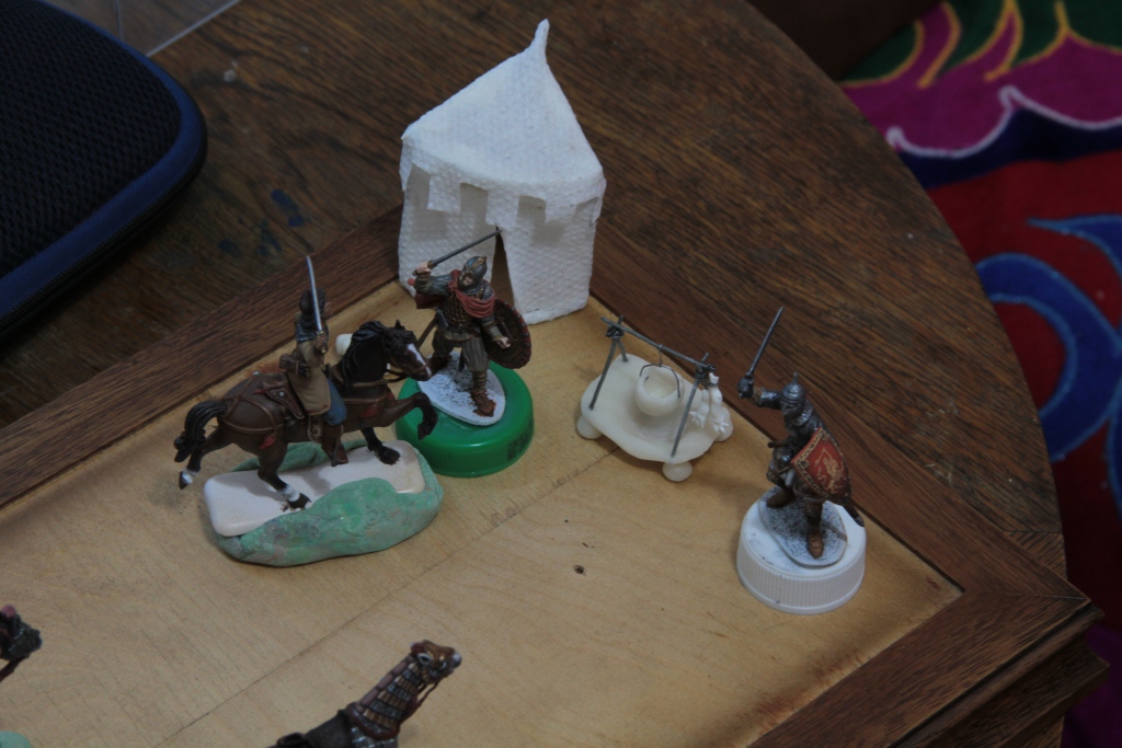 Хочу также выразить огромную благодарность моему другу Мише за его совет по созданию шатра. Технология проста и гениальна: на проволчный каркас натягивается салфетка (обычная тканевая влажная салфетка) крепится на основу и пропитывается клеем ПВА и все. Мой шатер в последствии ожидает грунтовка и покрас конечно же. Зайчики, которых хотят приготовить происходят из набора животных Тамия. Вся остальная лагерьная утварь самодельная.