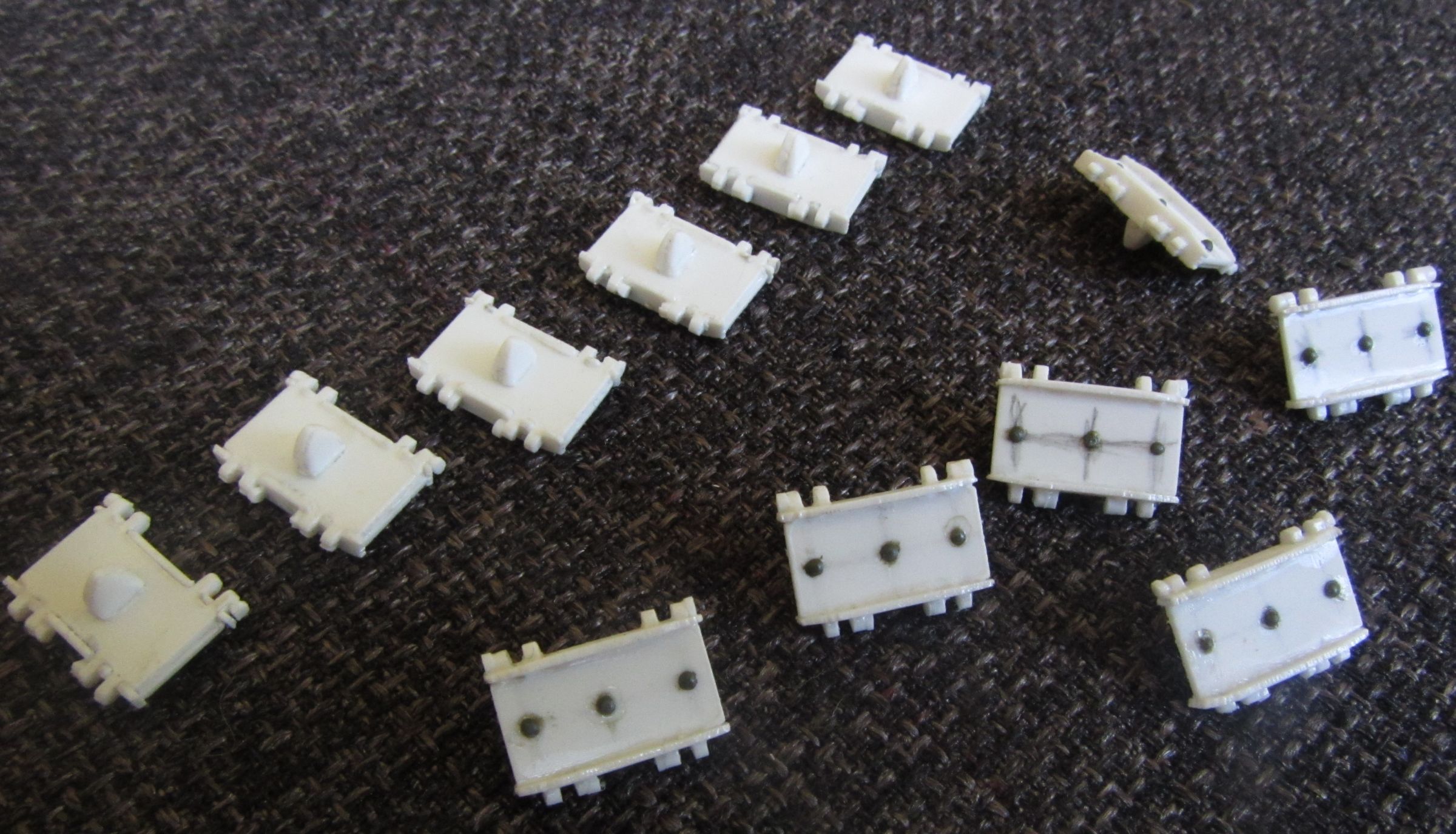 4. Они явно были из жести, промятости есть на фото. Поэтому варианты с пластиком следует отбросить. По крайней мере наружный слой должен быть из жести. Варианты: найти фирму кто бы мог сделать фототравление по чертежам; изучить возможность сделать это самому; сделать всё невидимое как обычно, а внешний слой вырезать из пивной банки.