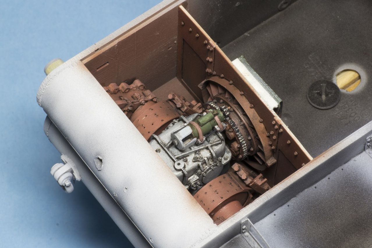 По совету Игоря сделал бачки для масла в трансмиссионном отделении. Получились не совсем копийно, но и видно то их чуть-чуть через люки...