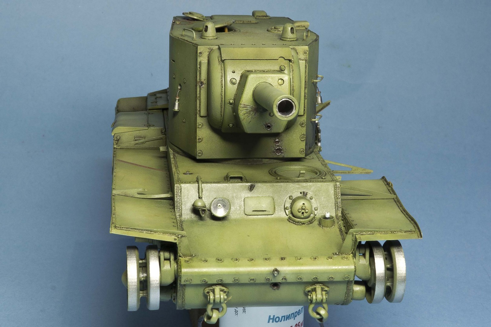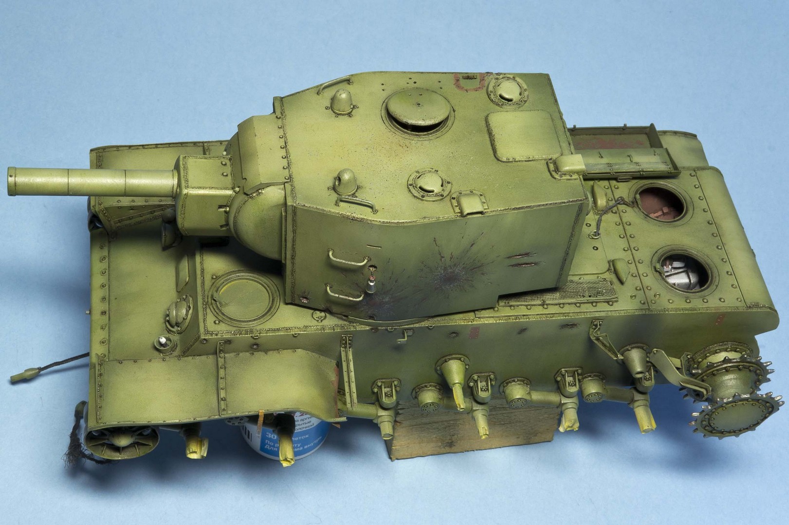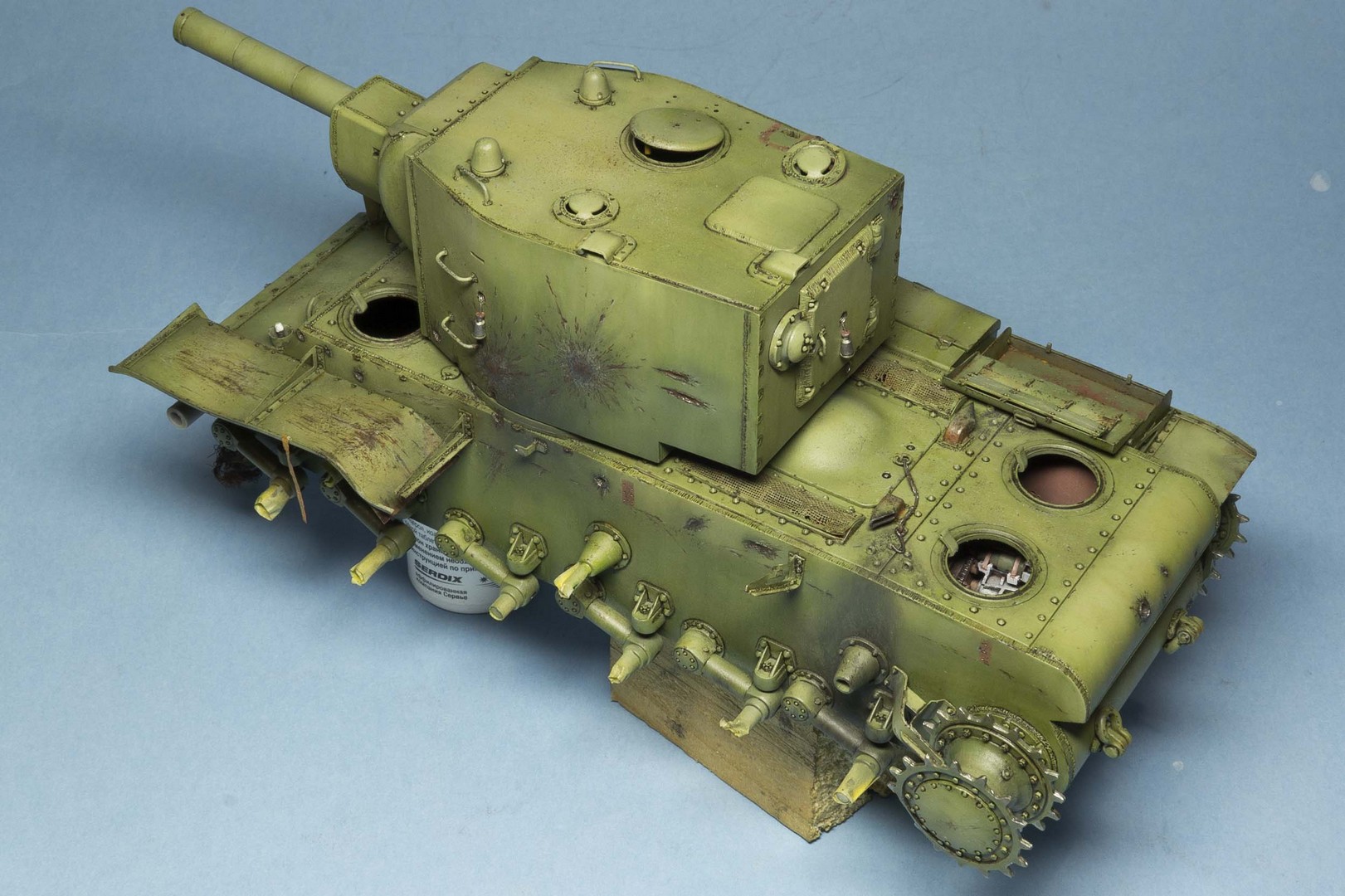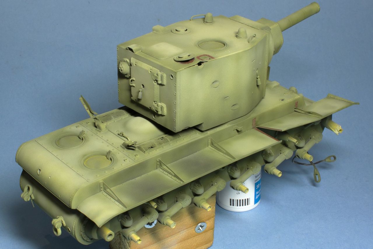 нарисовал сколы на башню. Танк был совершенно новым перед атакой на Остров и вряд ли успел насобирать сколов. Попытался только изобразить потертости на крыше от ног любопытсвующих после боя.