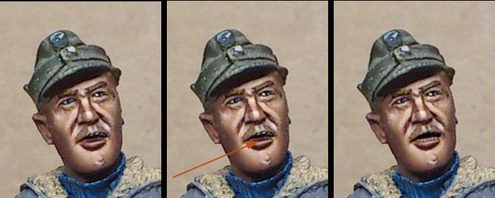 не стремлюсь передать мимику живого человека по той простой причине, что это - игрушка, солдатик, только дорогой. И она должна быть зрелищной.Нет. я мог бы, конечно в один цвет лицо покрасить, нарисовать глаза на нижнем веке, но зато реалистично изобразить верхнюю губу, которую, кстати, скульптор не слепил.