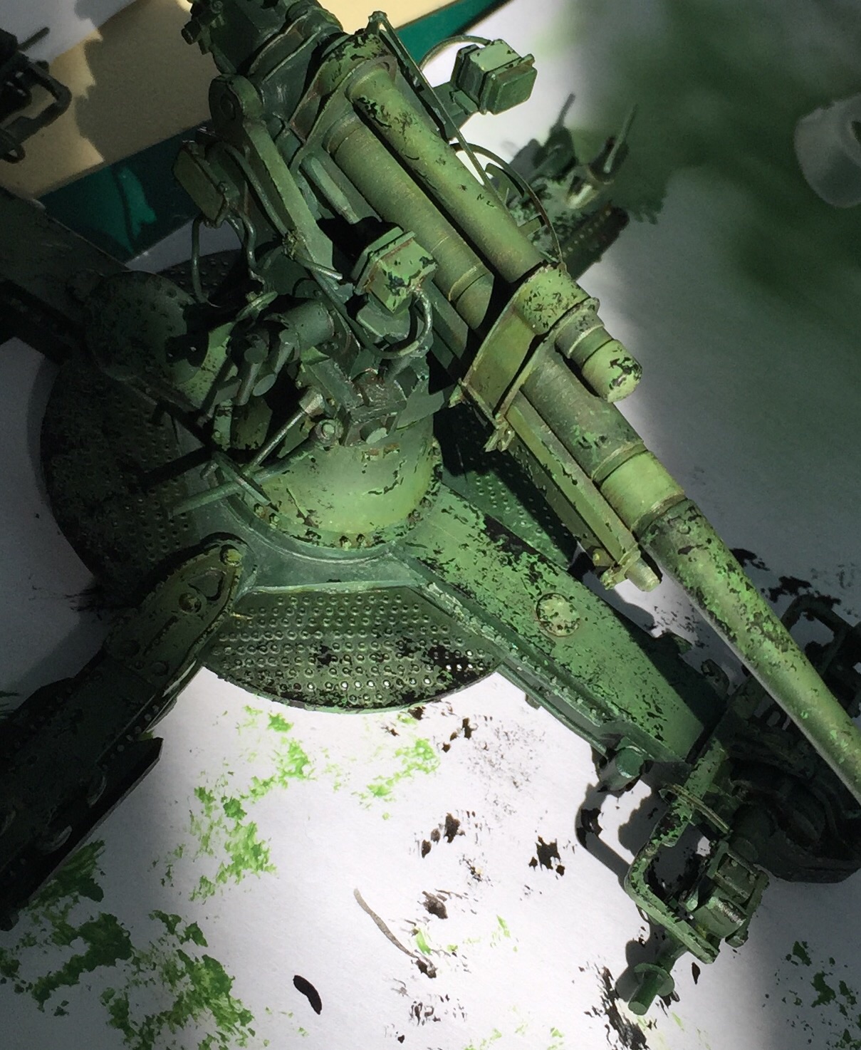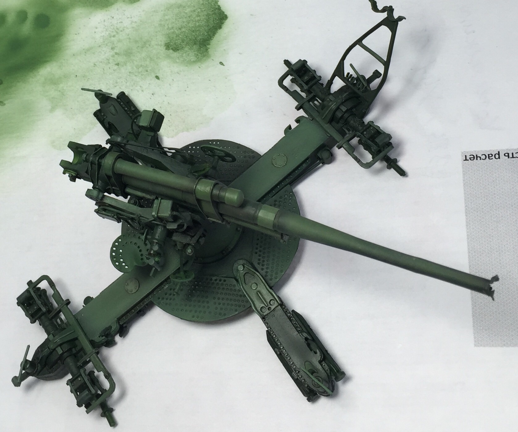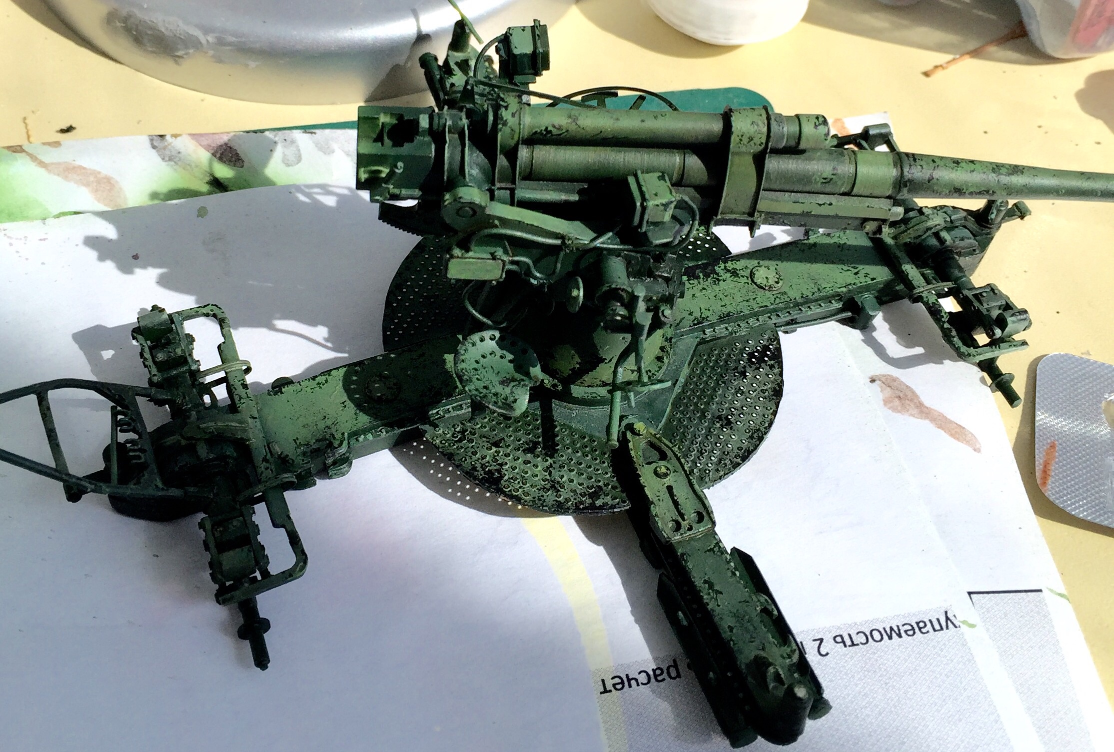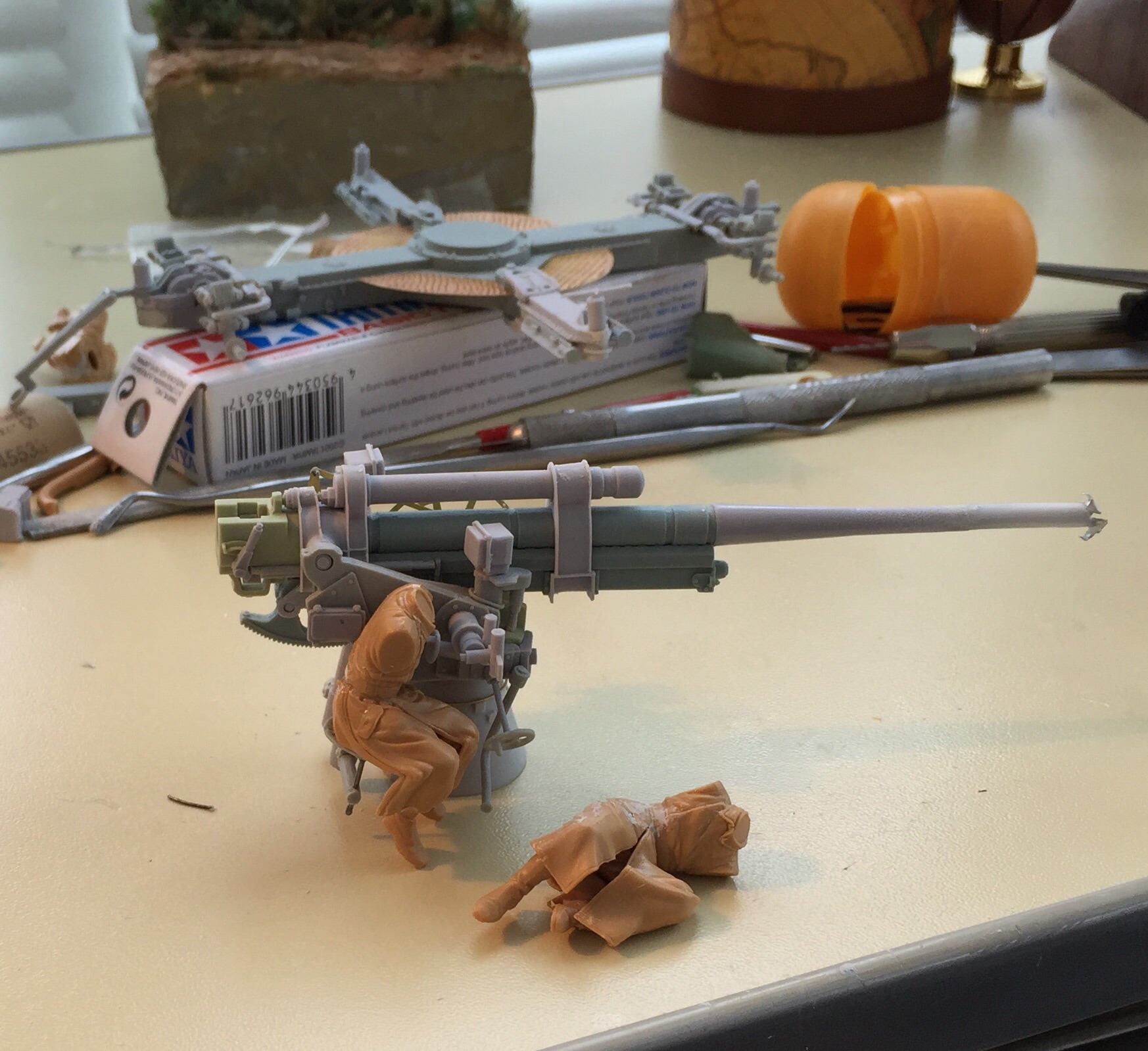 Медленно, но верно илет построение зенитки.. Скажу как есть- сплошной обман!! Вместо отличного качества литья из смолы- детали со смещениями, облоем, металлического ствола просто не оказалось в наборе! Об инструкции- я промолчу.. Ужас:) тем не менее, работа идет.. Отрезал ствол, нарастил секцией от автомобольной антенны, "разорвал" стаол.. Грунтовка покажет где нужно доработать место соединения!