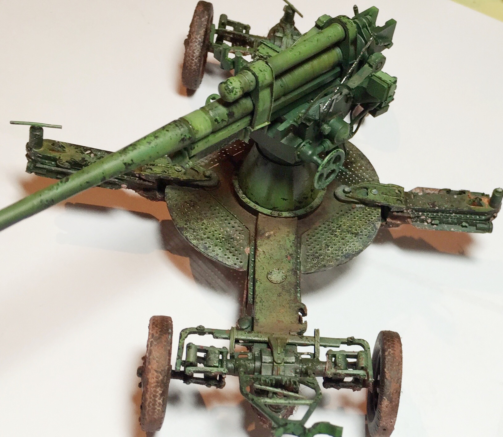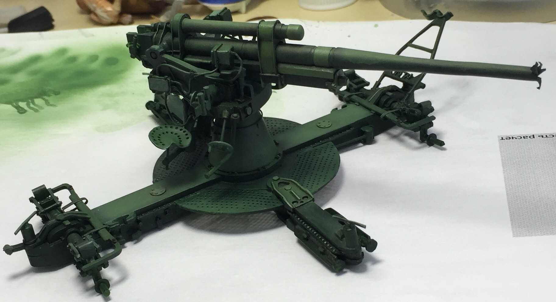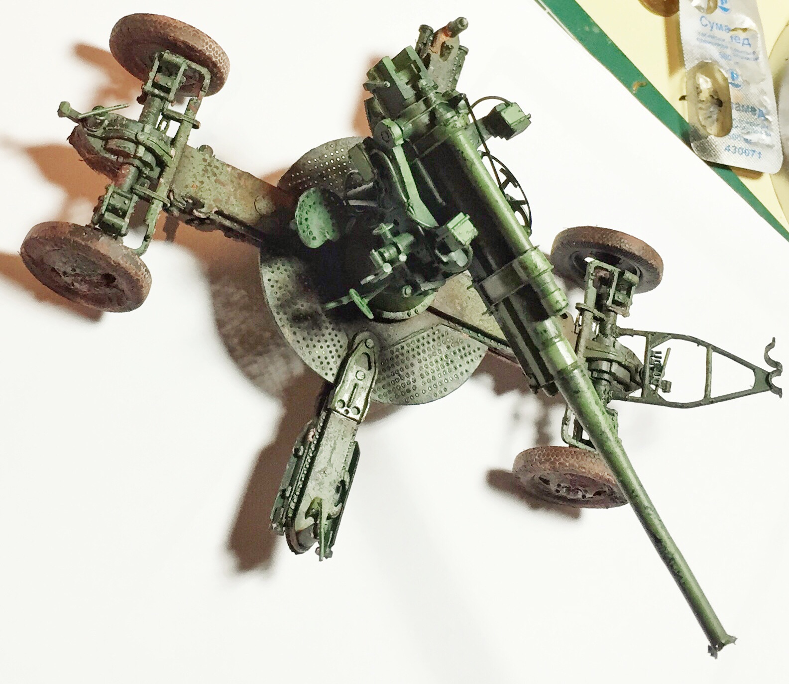 Медленно, но верно илет построение зенитки.. Скажу как есть- сплошной обман!! Вместо отличного качества литья из смолы- детали со смещениями, облоем, металлического ствола просто не оказалось в наборе! Об инструкции- я промолчу.. Ужас:) тем не менее, работа идет.. Отрезал ствол, нарастил секцией от автомобольной антенны, "разорвал" стаол.. Грунтовка покажет где нужно доработать место соединения!