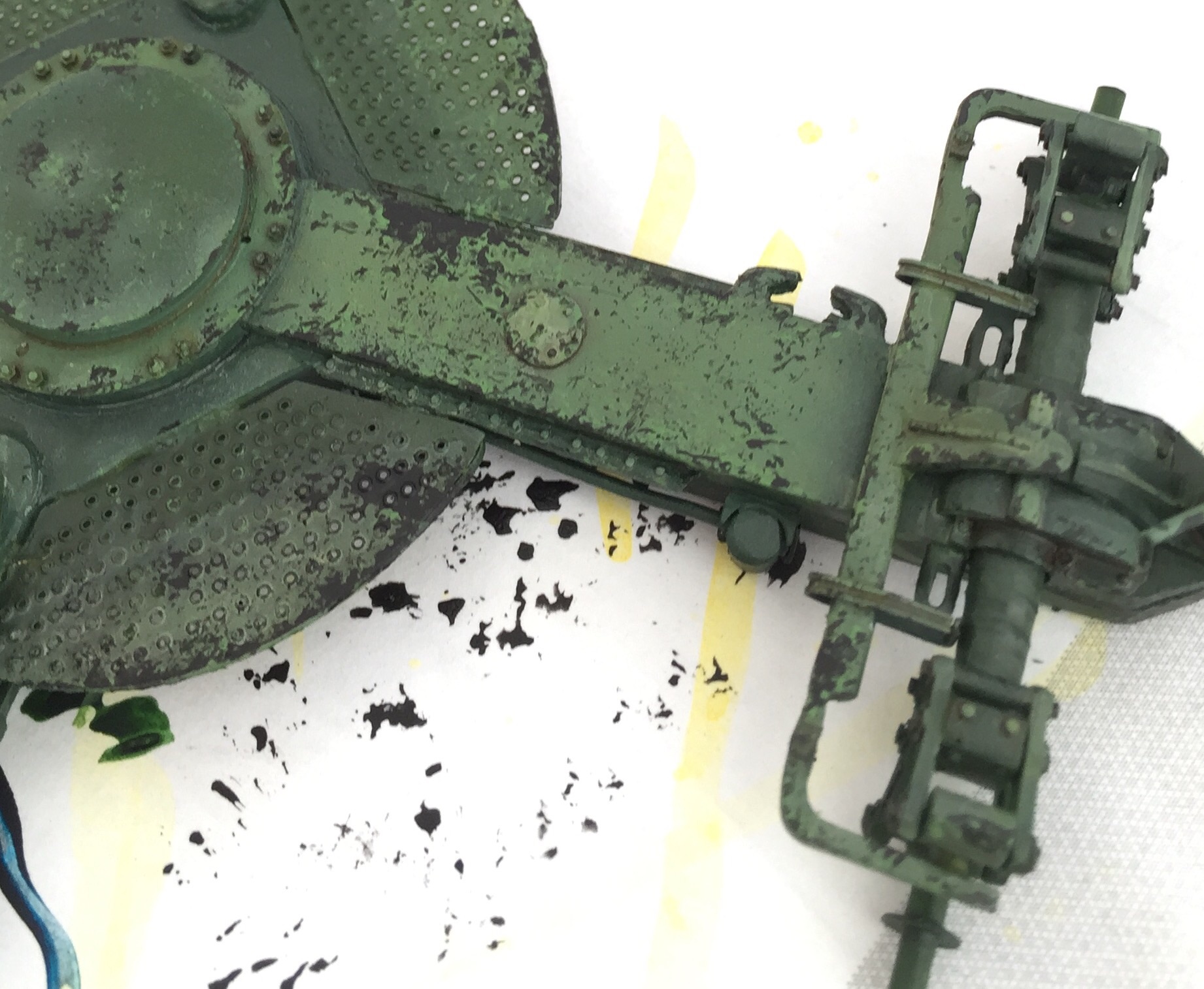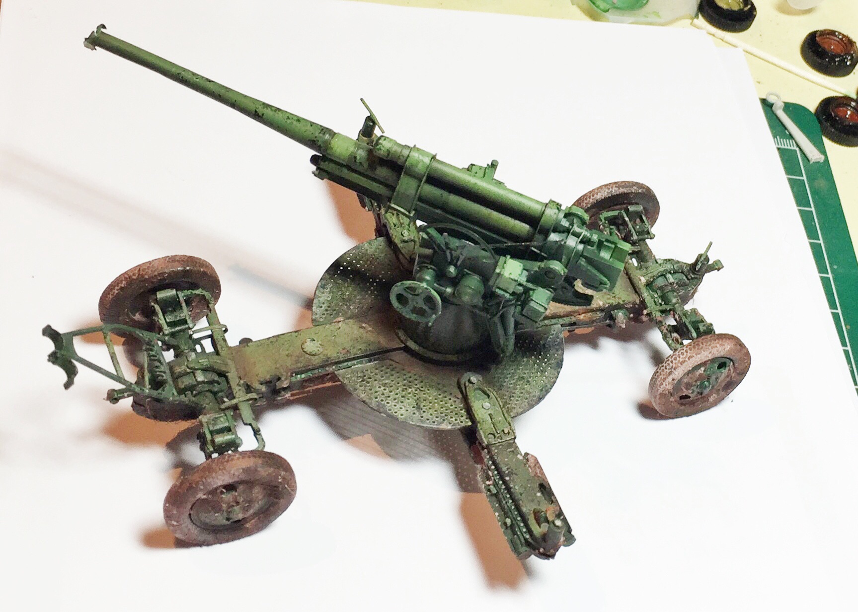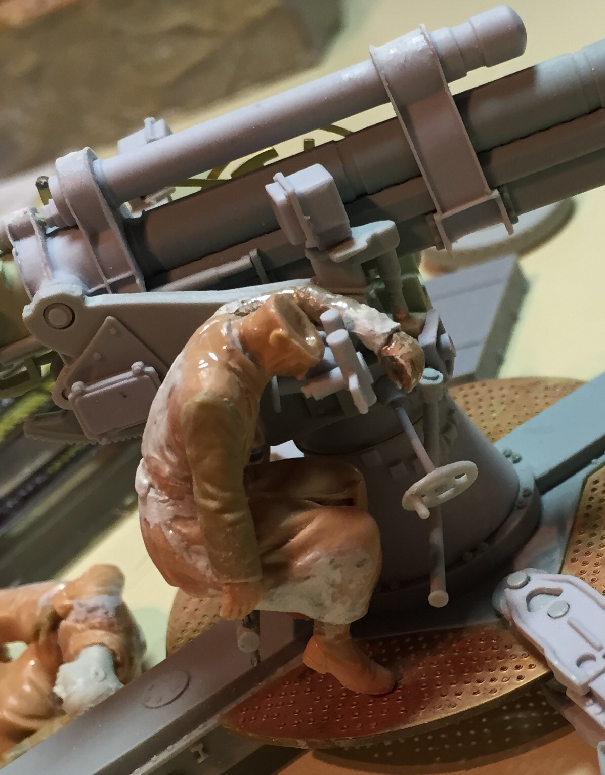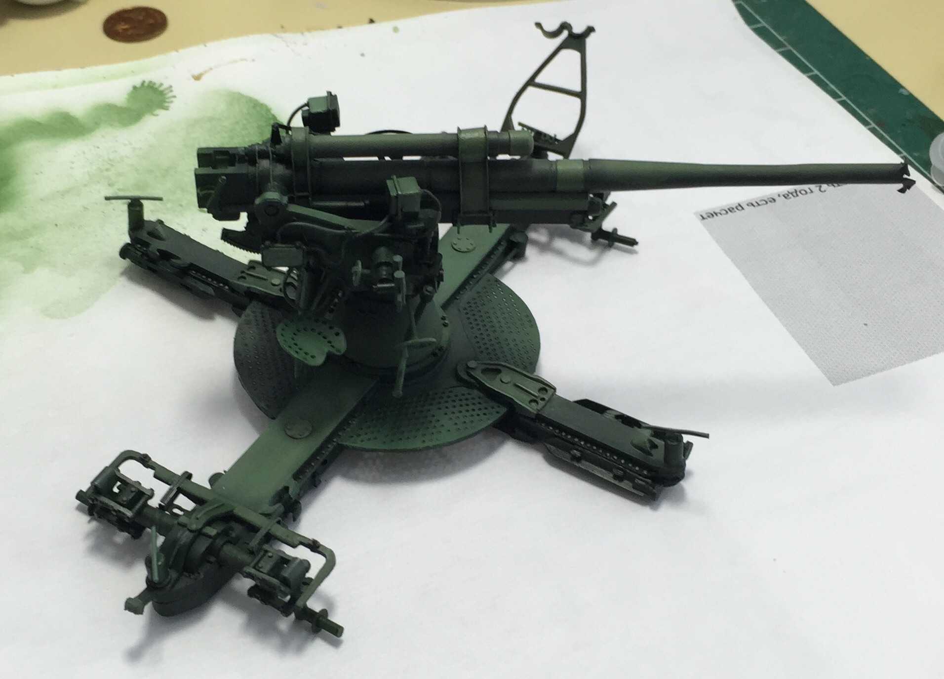 Медленно, но верно илет построение зенитки.. Скажу как есть- сплошной обман!! Вместо отличного качества литья из смолы- детали со смещениями, облоем, металлического ствола просто не оказалось в наборе! Об инструкции- я промолчу.. Ужас:) тем не менее, работа идет.. Отрезал ствол, нарастил секцией от автомобольной антенны, "разорвал" стаол.. Грунтовка покажет где нужно доработать место соединения!