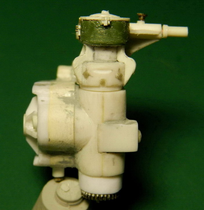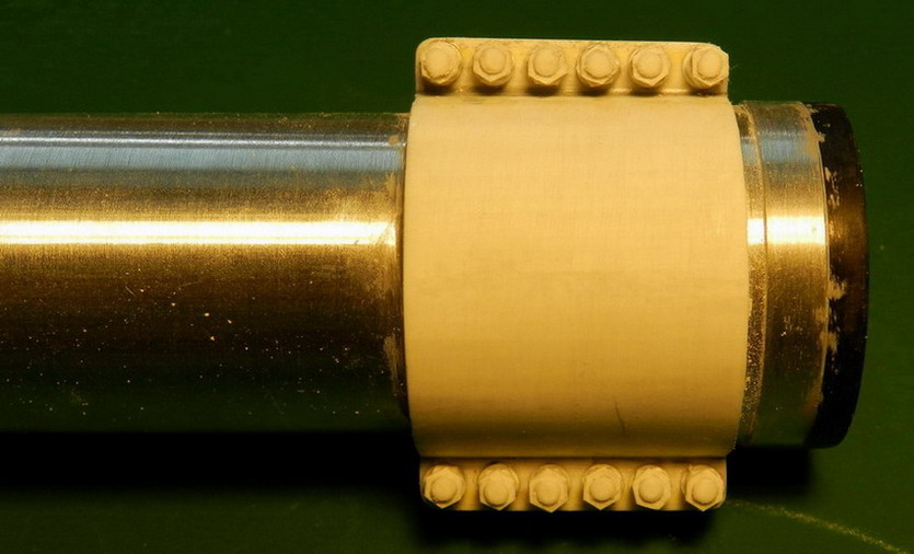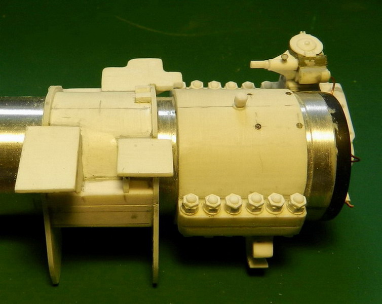 Продолжакю "нанизывать" детали на ствол. Вы уж меня извините, что я зачастую не знаю как правильно назвать детали или их назначение. Руководства то нет. На верхней части передней обоймы поставил стопорный болт и винты. На казённой части установил стпор для затвора в закрытом состоянии (сбоку) и стопор для открытого затвора. Снизу приклеил два кронштейна для цилиндров гидравлики.