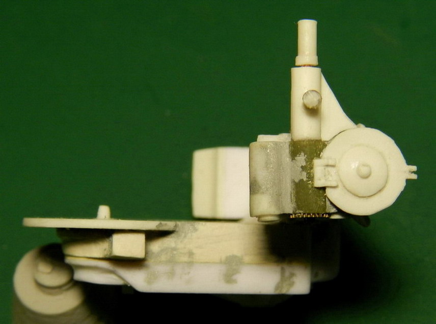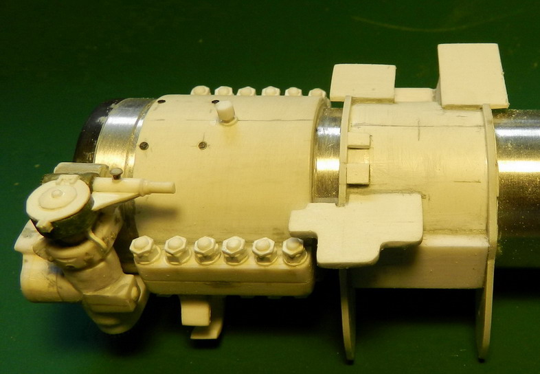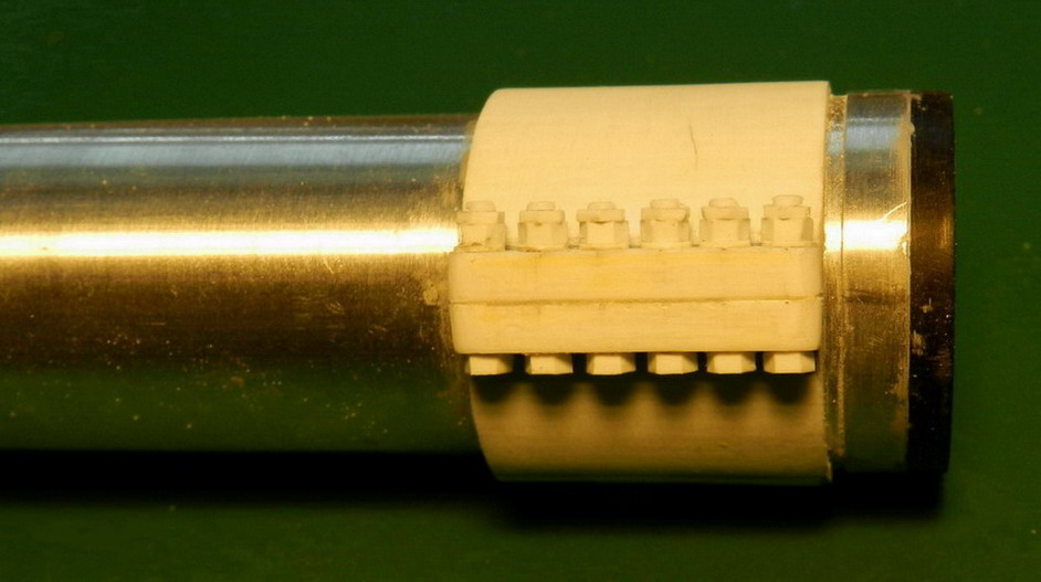 Сделал заднюю обойму на ствол. Болты крепления довольно большие. Пришлось нарисовать и распечатать на принтере головки болтов и гайки, перевести на полистирол и вырезать. Занимательный процесс.