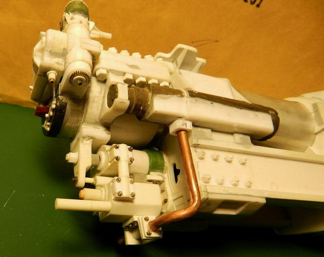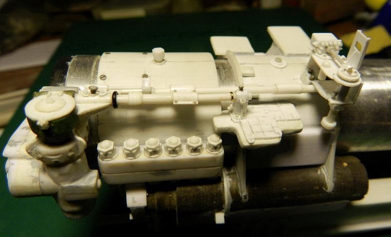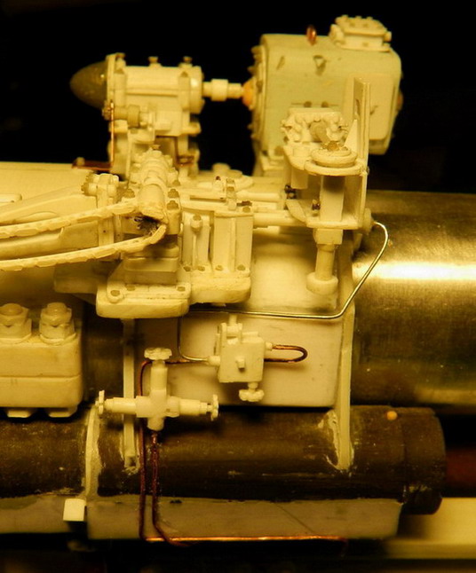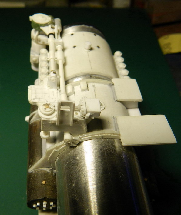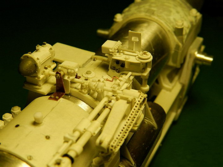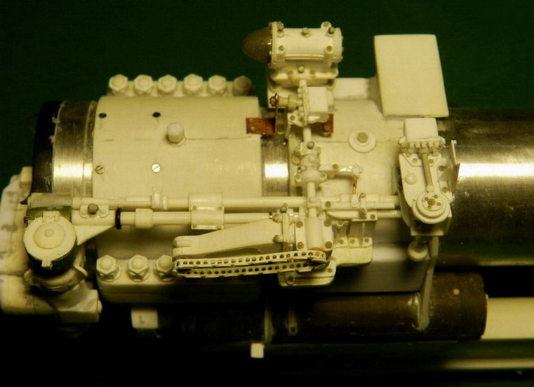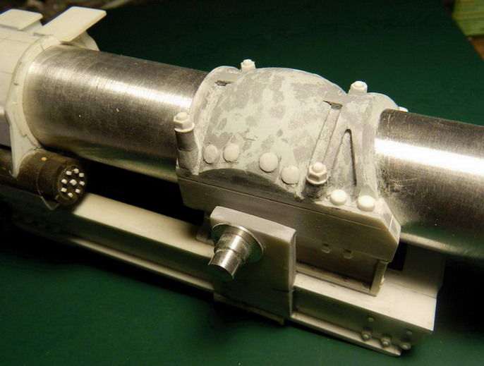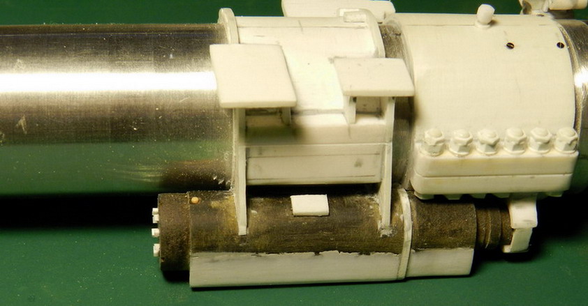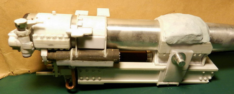 Нагородил под казённой частью на люльке детали отката и наката ствола. Из эпоксилина сделал нашлёпку для будущей верхней цельнолитой части передней обоймы. Потом отсеку лишнее.