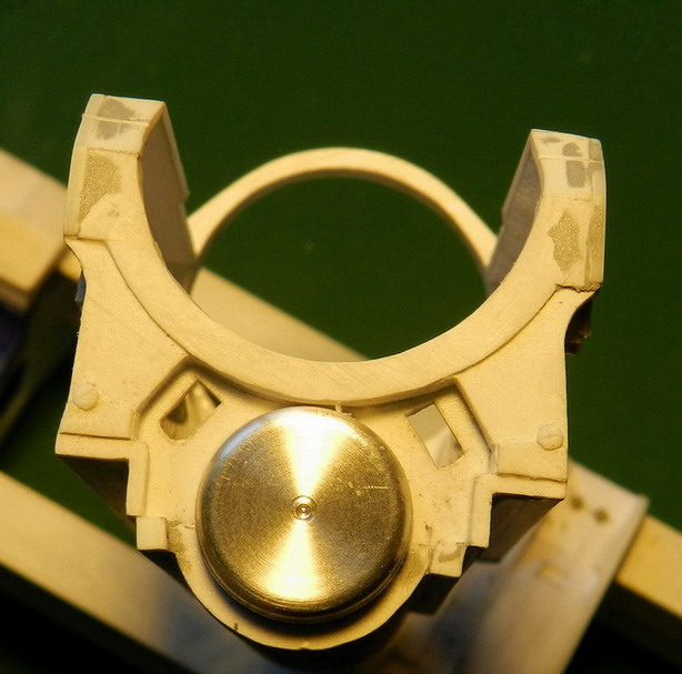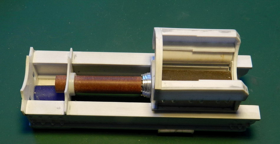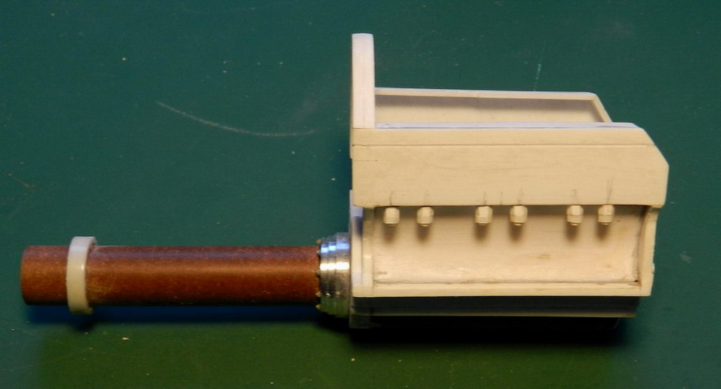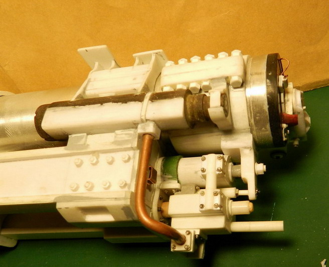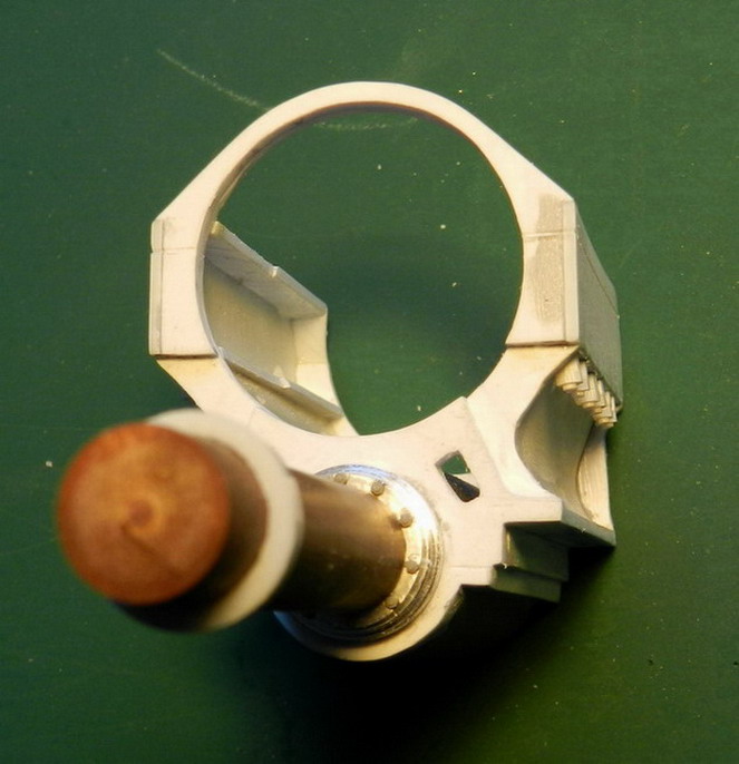Далее собрал переднюю обойму с цилиндром и поршнем тормоза отката. Цилиндр выточил из эбонита, поршень из текстолита, крышки цилиндра из дюраля. Остальное из полистирола. Установил обйму на люльку. Обойма ещё не закончена. Верхнюю часть буду делать после установки ствола.