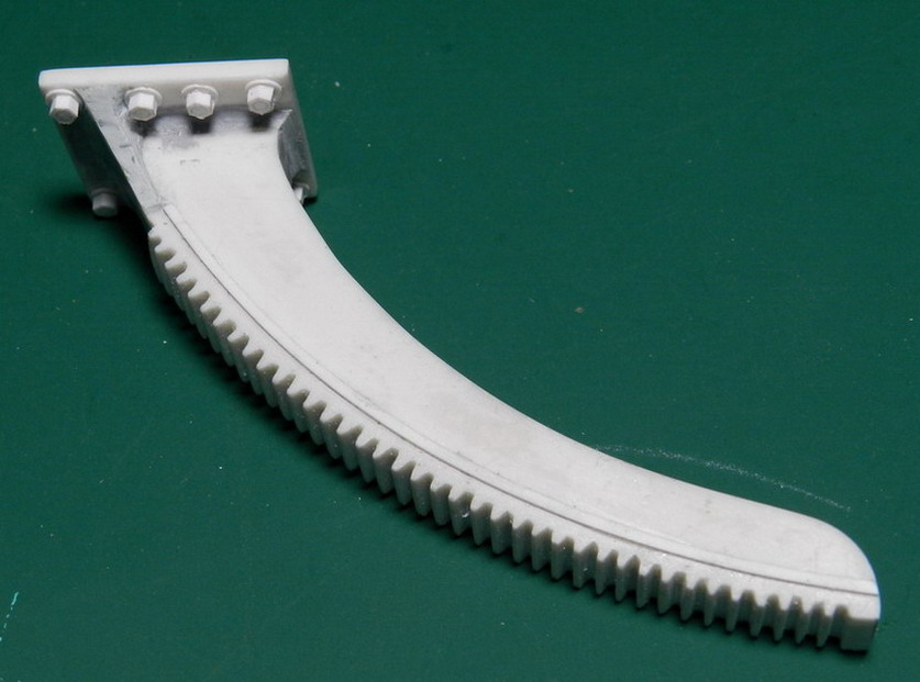 Изготовил сектор подъёмного механизма. Склеил трёхслоный бутерброт из полистирола, выпилил лобзиком. по разметке нарезал зубья, приклеил основание с болтами. Установил сектор в гнездо под казённой частью.